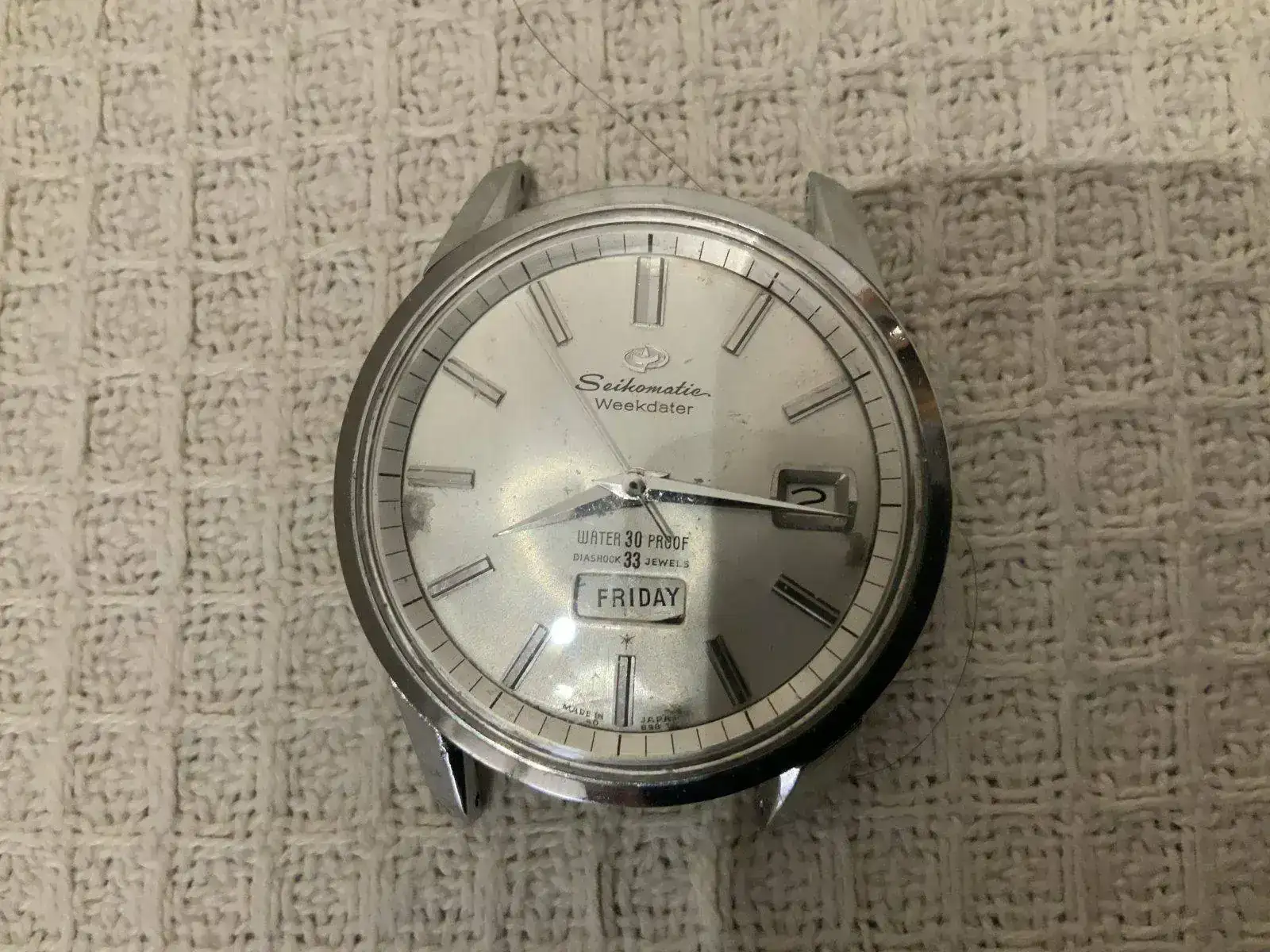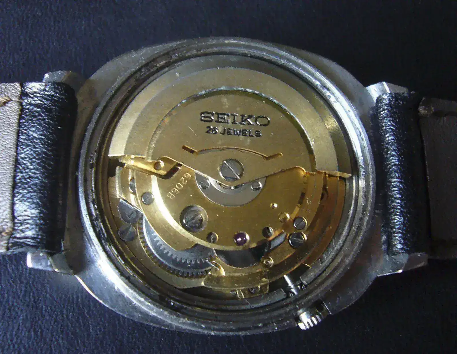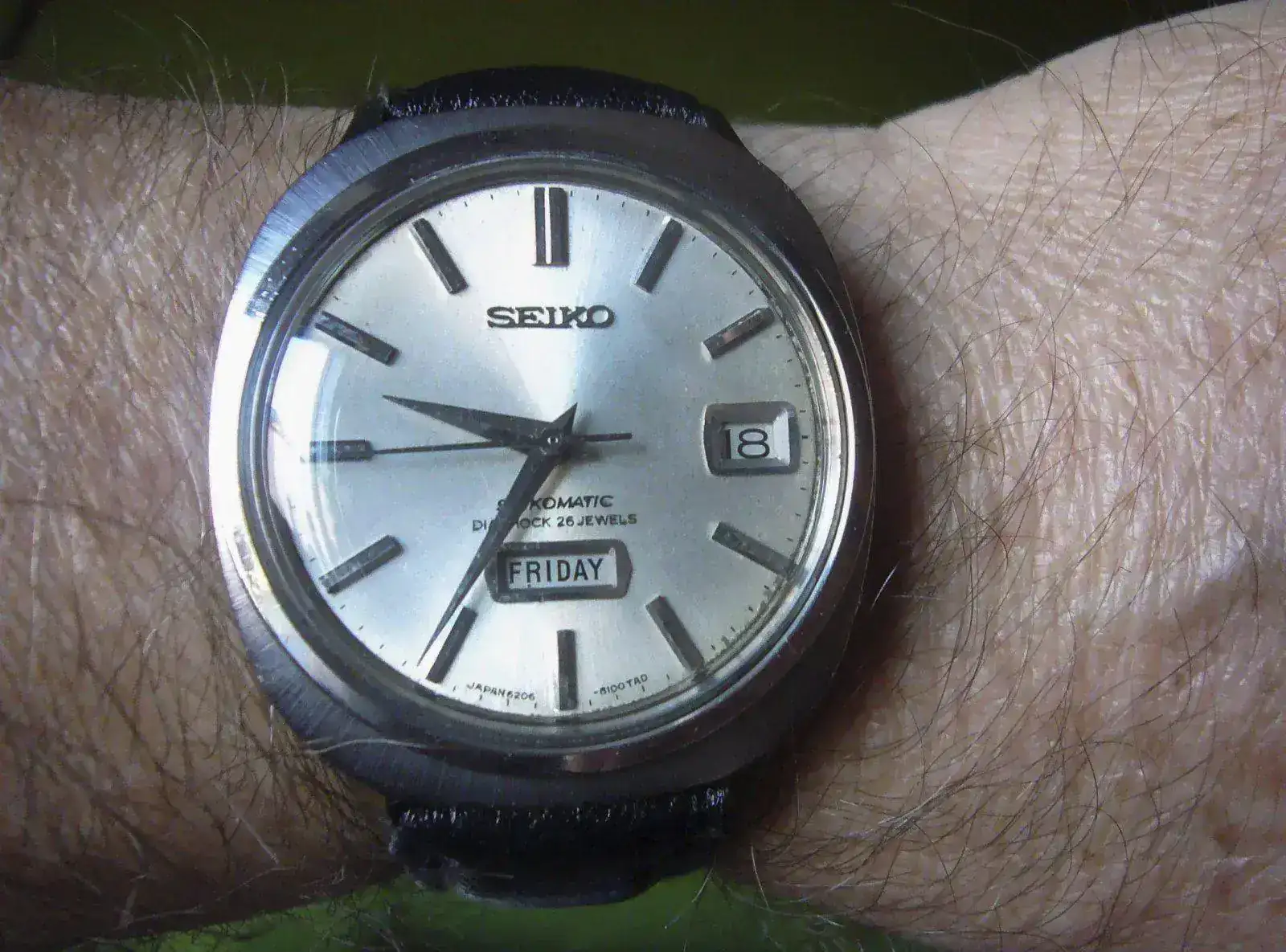 Este es un reloj especial por muchas cosas: ya he dicho muchas veces que fue una compra maestra en cuanto a precio-calidad porque su anterior dueño decía que no sabía usar relojes automáticos y no funcionaba; nada de nada, funciona perfectamente; es un reloj de la época dorada de relojería, julio del 66; como tal tiene su interior dorado y 26 jegüeleses y masa oscilante enclavada en cojinete y con dos ventanas separadas para fecha y día. No he visto muchos así, concretamente ninguno, aunque seguro que haberlos haylos.