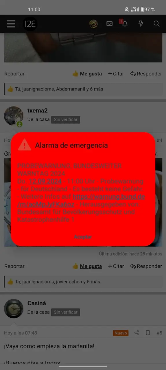 Yo ya estaba preparado y aun así me ha pillado por sorpresa. Eso y que se ponen a sonar todas las alarmas de la ciudad como si nos estuviesen bombardeandoEstás tranquilamente dándole me gusta al fabuloso trío de Txema y disfrutando de las piezas vintage de los compañeros. De repente, salta una simulacro de señal de emergencia nacional con el móvil pitando a todo volumen y tu durante un décima de segundo piensas, "mierda, me he cargado el foro!" en lugar de correr por tu vida...