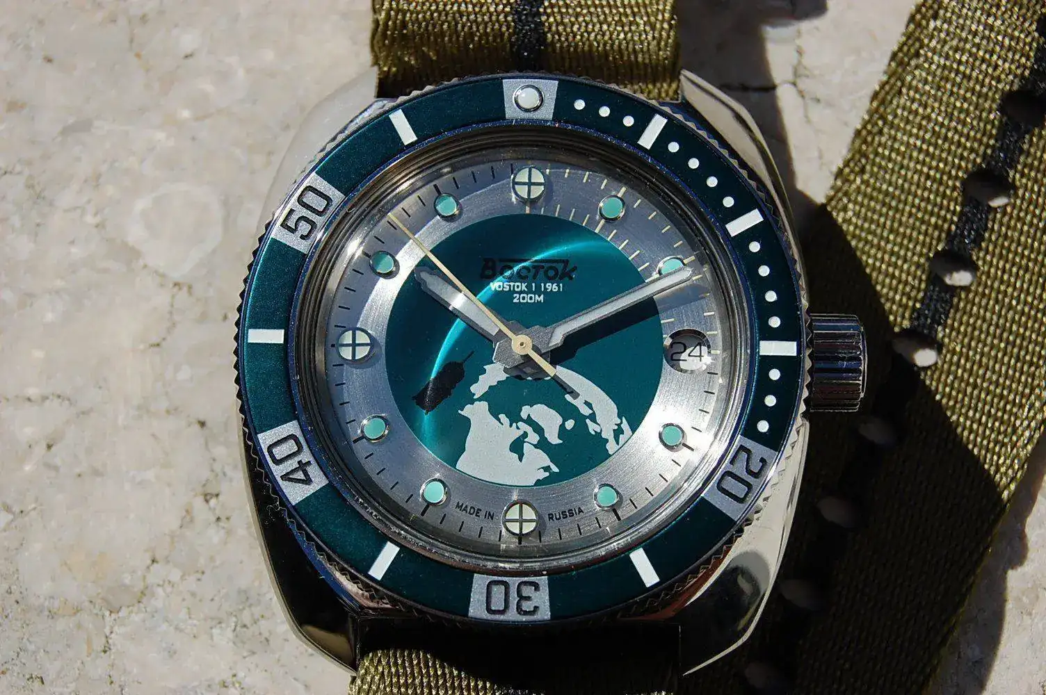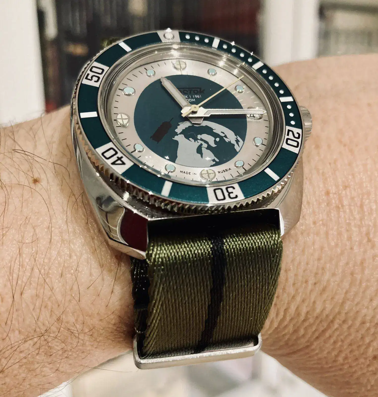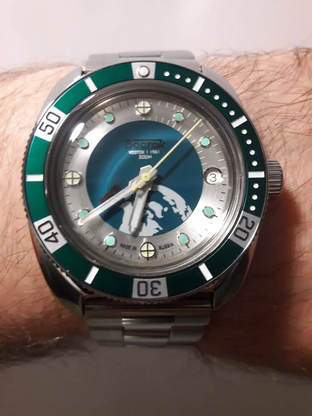 este año se conmemora el 60 aniversario del primer vuelo orbital alrededor de la tierra, como sabréis la mayoría de compañeros de este foro de rusos; oues me he encontrado con un bonito detalle por parte de un vendedor ruso que desconocía, ha creado un dial para la ocasión, muy bien terminado, disponible en dos colore, verde azulado, el que me he quedado yo, y os mostraré mas adelante, acompañado de un bisel en el mismo tono, el otro es en color beig con el bisel negro; el dial muestra una parte del planeta desde el punto de vista del espacio y junto a el, la nave tripulada por Yuri Gagarin, en la parte izquierda, haciendo contraste; en la parte superior del dial encontramos el nombre de Vostok y en la segunda línea está escrito Vostok - 1 1961, así de sencillo, pero bien trabajado; la trasera es la común a cualquier Amphibia, en cuanto a las agujas, tiene una divertida forma como de cohete, o así lo entiendo yo, y que me han hecho gracia al no tener nada parecido en la colección de rusos. Finalmente el Vostok - 1 viene acompañado de una correa nato, en este caso verde militar con una pequeña línea negra en el centro, y la calidad es bastante aceptable.
