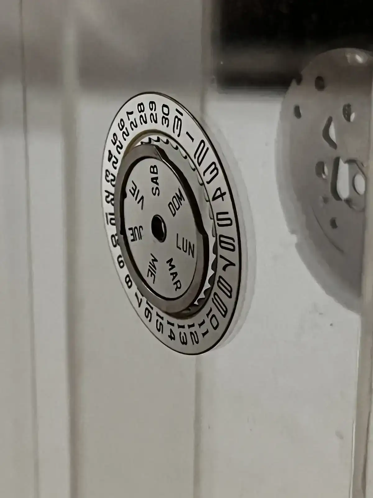 Las ruedas del datario se mueven gracias a unos dientes interiores que engranan con el sistema de cambio de hora y en el caso de esta maquinaria la posibilidad en la segunda posición de la tija pasar el día de manera manual.