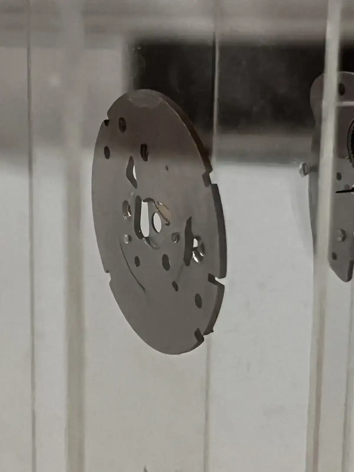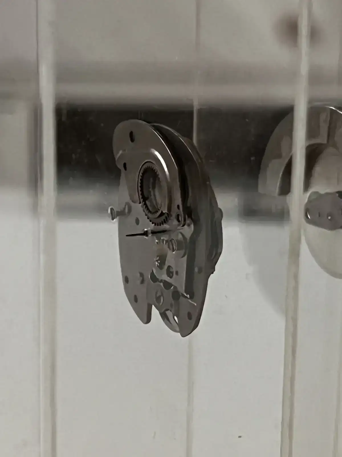 En la siguiente lámina están incrustadas las agujas junto con sus ruedas horaria y minutera,ruedas que engranan en la maquinaria aunque en este caso esté fuera para posicionar las agujas y que se vean.