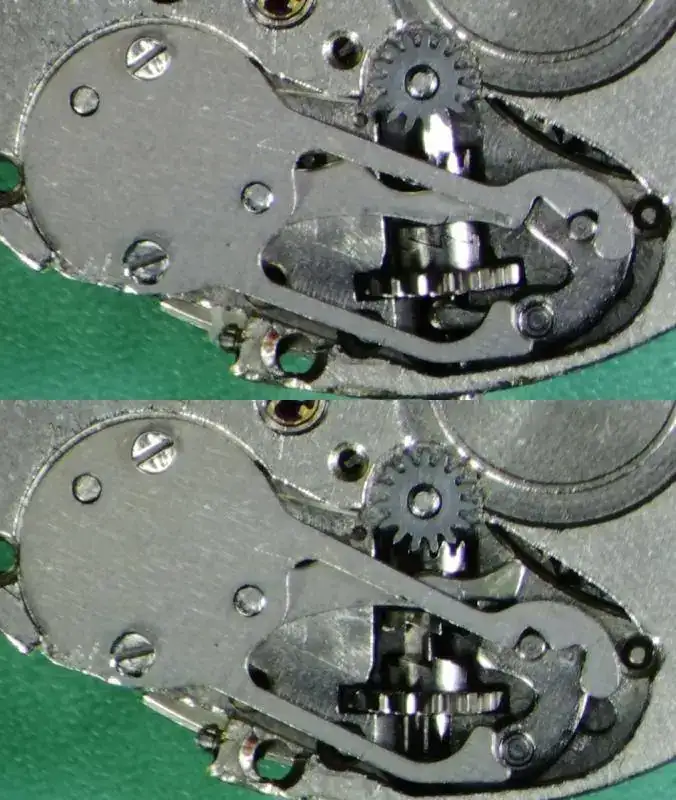 Entonces, dado que el piñón corredizo tiene 13 dientes, cuando está en la posición de ajuste, una vuelta casi completa del tija de remontuar hace que las manecillas del reloj avancen 1 hora.