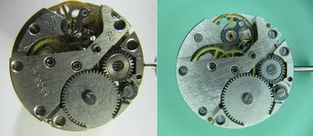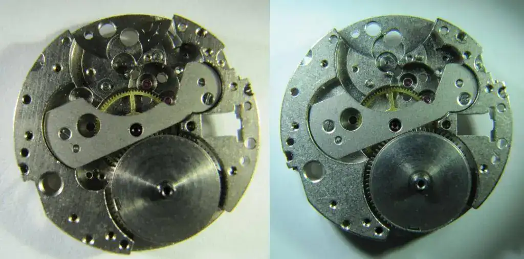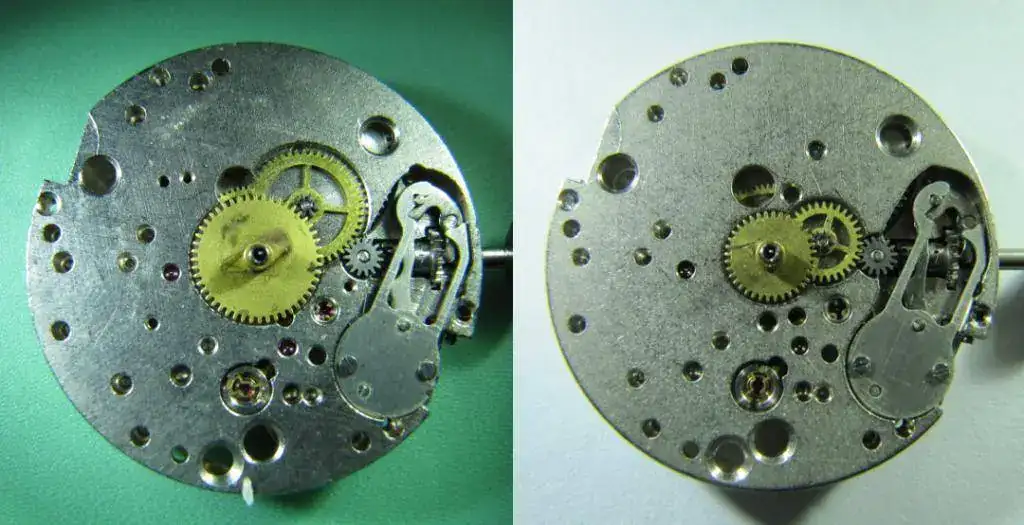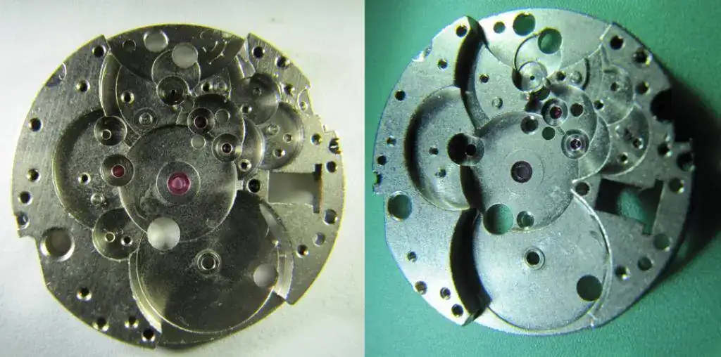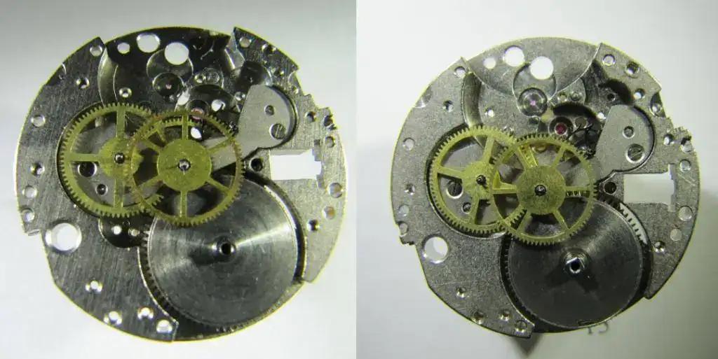 En el lado de la montra, lo mecanismo de puesta en hora son iguales pero el resto es diferente, para que la platina pueda acomodar las ruedas de minutos y horas más grandes.
