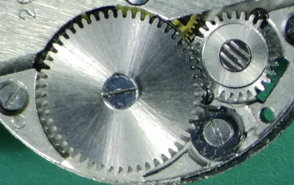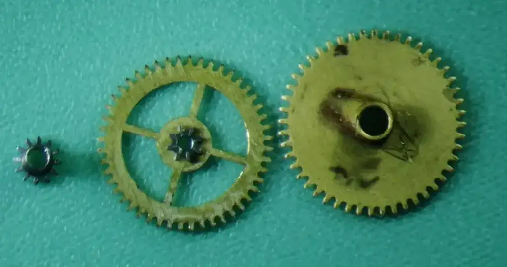 Una revolución del piñón de minutos significa que la rueda de minuto avanzó 12 dientes, la rueda de ajuste intermedia avanzó 12 dientes y el piñón corredizo avanzó también 12 dientes.