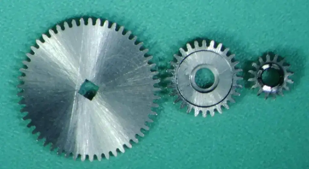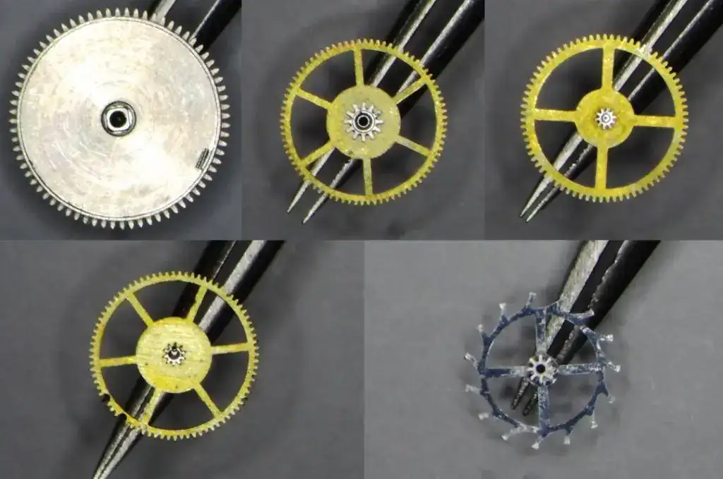 El piñón de remontuar que tiene 16 dientes, la rueda de corona que tiene 28 dientes y la rueda de trinquete que tiene 53 dientes forman el tren de remontuar. Estas 3 ruedas se muestran en la siguiente imagen.