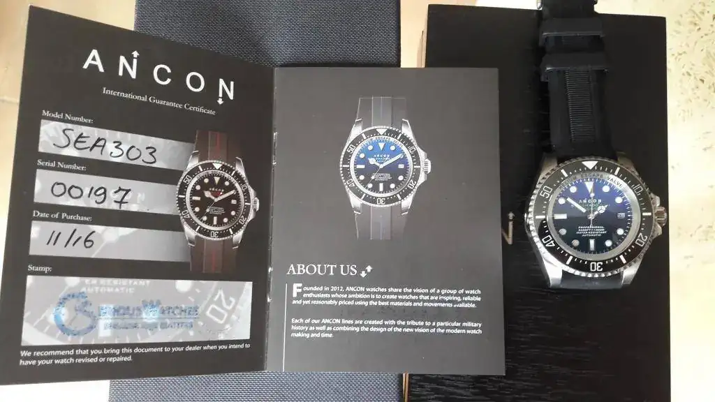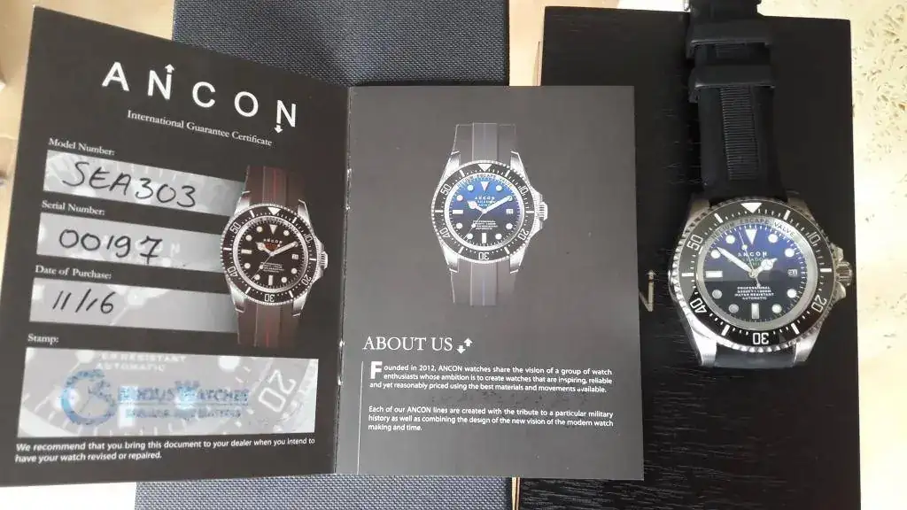 Va con su dotación completa: doble caja (exterior de cartón, interior de madera) en estado excelente, como nuevo, libreto/catálogo con fecha de adquisición y correa de caucho original de serie. Se adjunta otra, la que lleva puesta, de caucho, Morellato, que a mi entender y gusto le queda aún mejor. El reloj está en excelente estado de todo y funciona como, ejem, un reloj. Una gran pieza para el que no tenga problemas con su similitud con el conocido modelo al que homenajea.