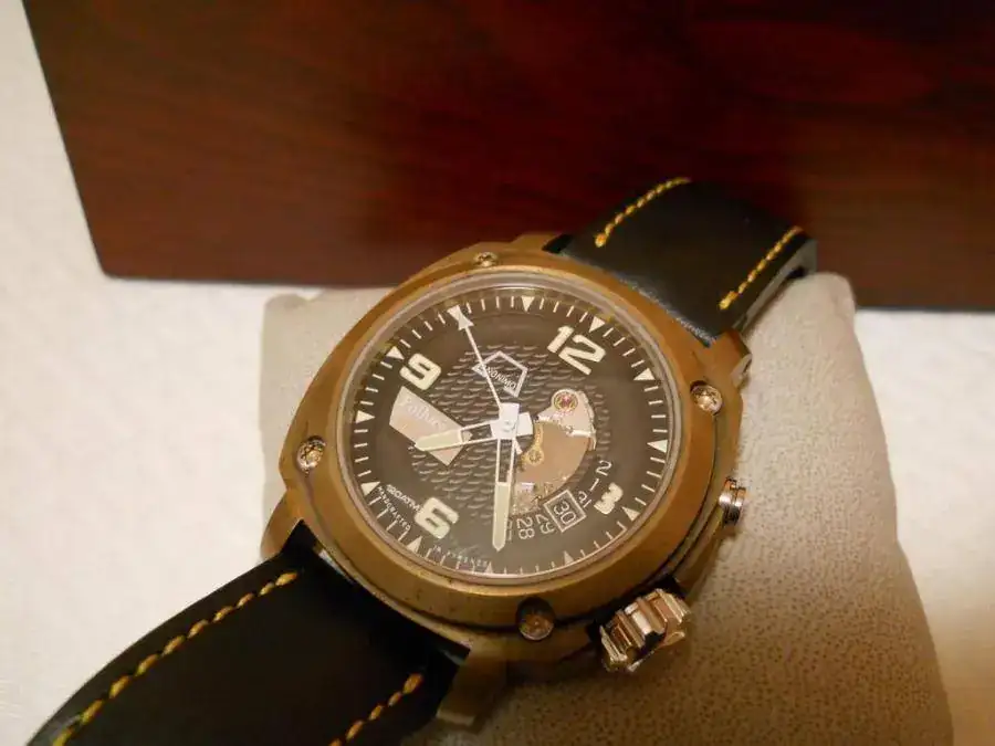 Lleva una pulsera Anónimo de piel con tratamiento Kodiak, resistente al agua salada durante 24 horas de inmersión continuada. Tiene un agujero practicado adicional y aunque usada, tiene bastante vida por delante.