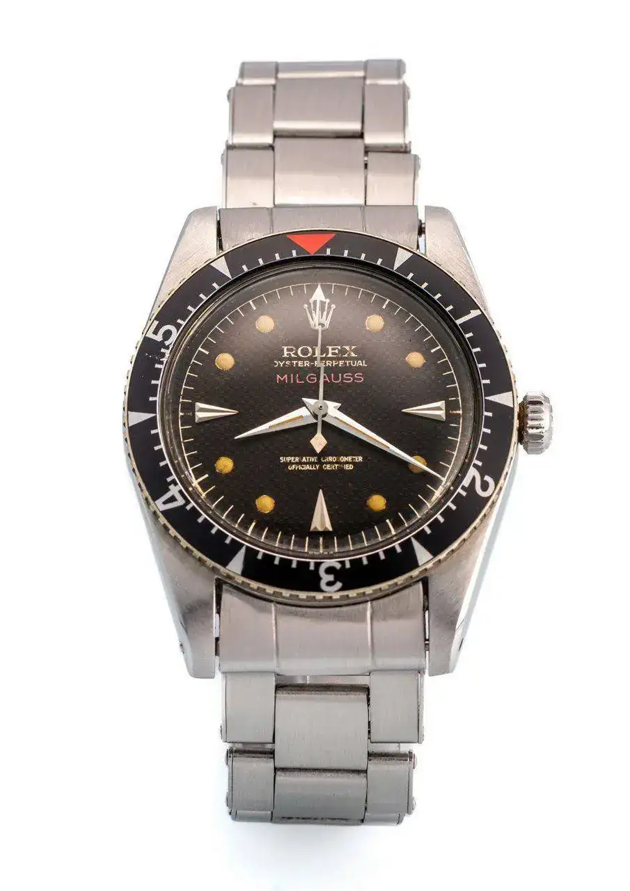 Lote 111. Rolex Migauss referencia 6541. Creado en 1954 para usuarios que trabajaran en entornos altamente magnetizados, es una auténtica rareza por la cortísima tirada que tuvo. Tengo una anécdota sobre esto: hace un par de años un conocido, completamente lego en la materia, me preguntó si creía que podía valer algo. Era de su padre, quien le había dicho que no perdiera el tiempo en un reloj tan viejo... Tenía la caja, los papeles, y hasta la factura de Unión Suiza. Todavía guardo las fotos.