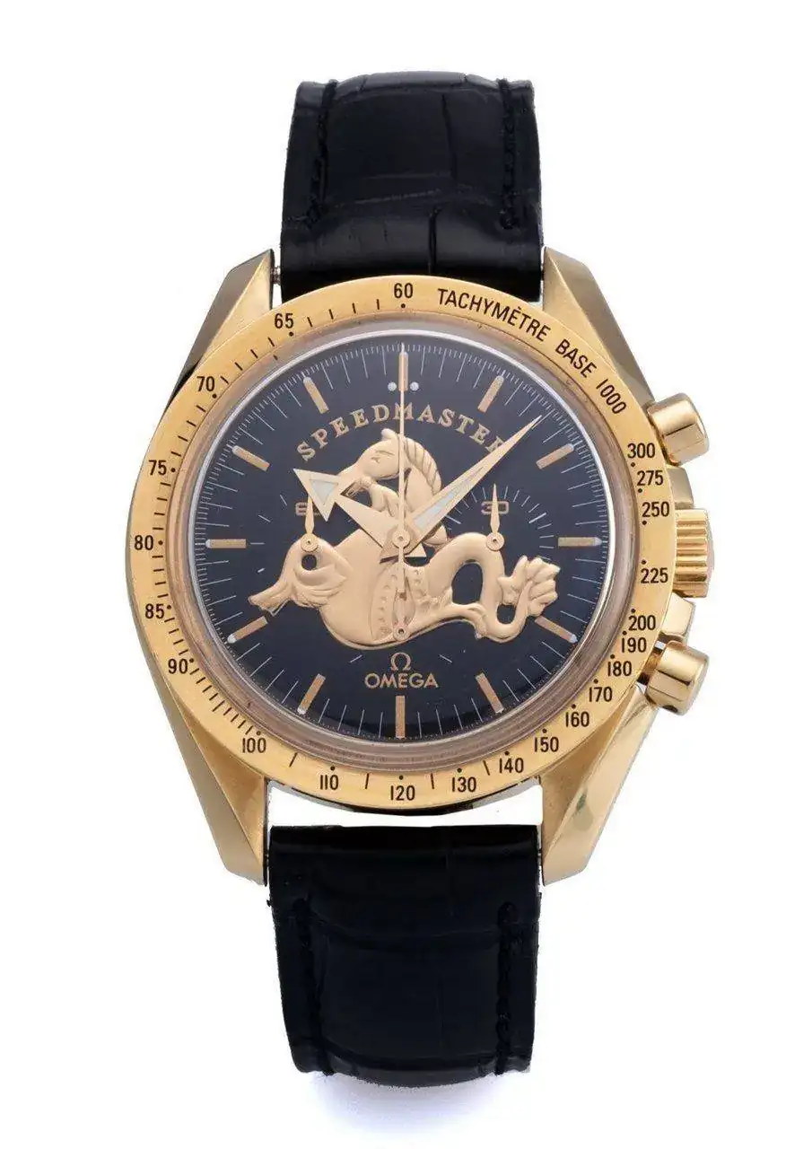 Lote 28. Oh, sorpresa. Un prototipo de Speedmaster (¿de dónde habrá salido?) de 1998 hecho para celebrar el 150 aniversario de la marca. Numerado 000/150, con el caballo marino en la esfera. Chapado, que no de oro.