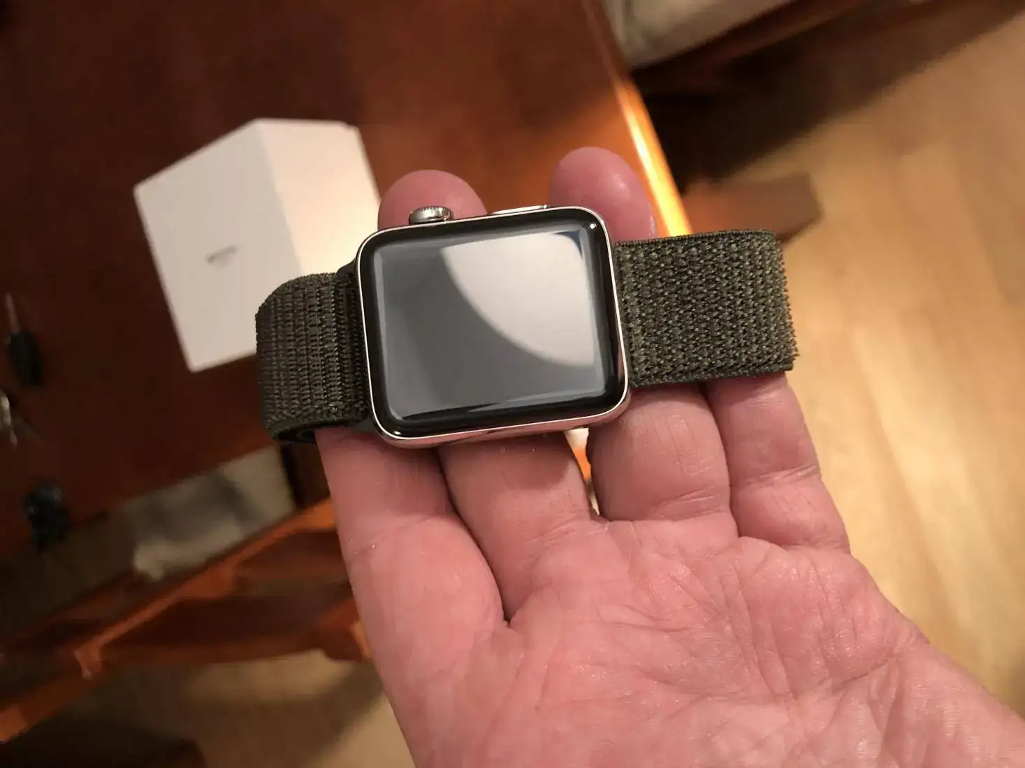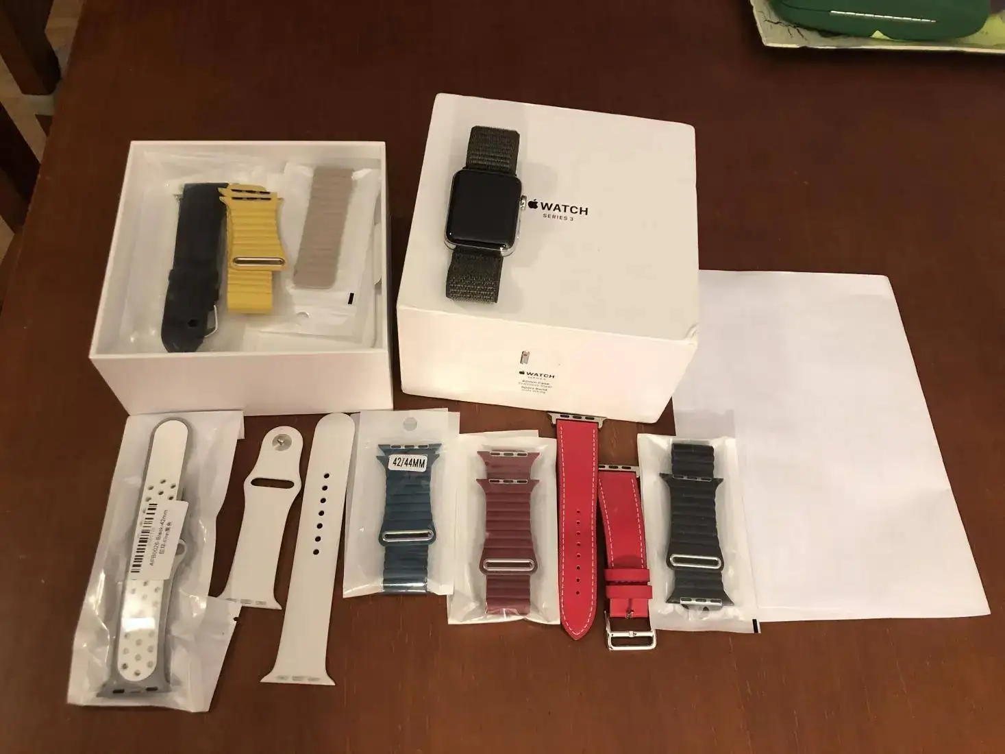 Viene en su caja, con cables y cargador, correa original de silicona blanca (en dos tallas, los de Apple piensan en todo) además de 2 correas de cuero y una de velcro también a estrenar y otras cinco de varios colores.