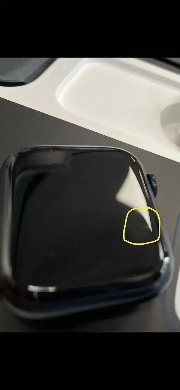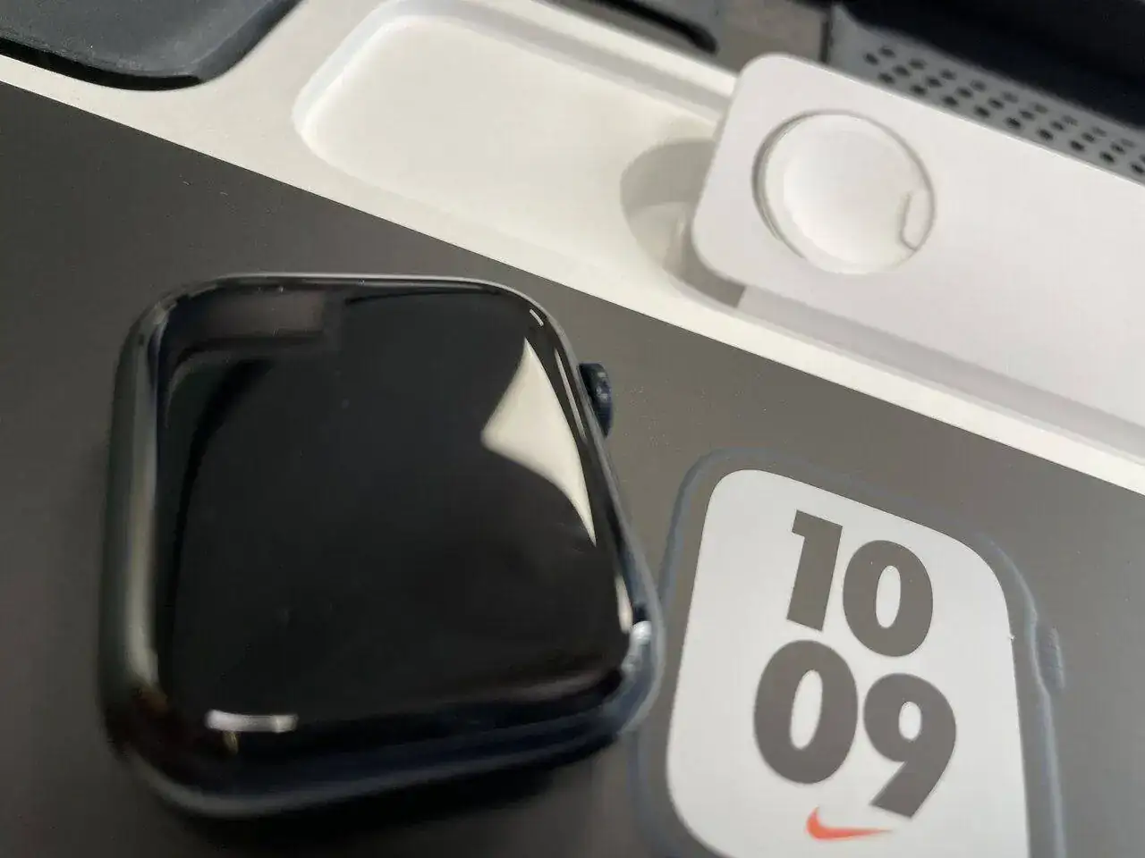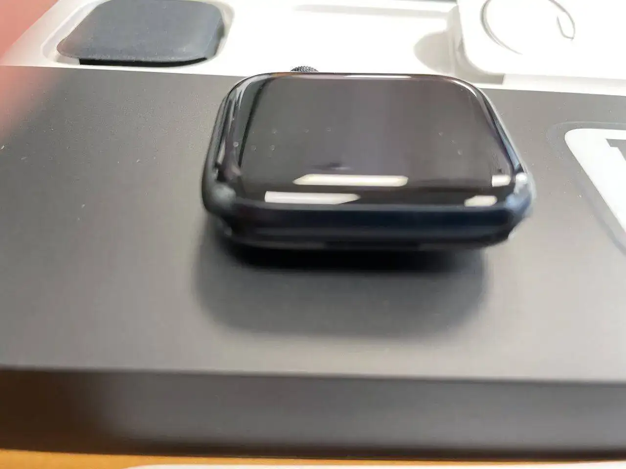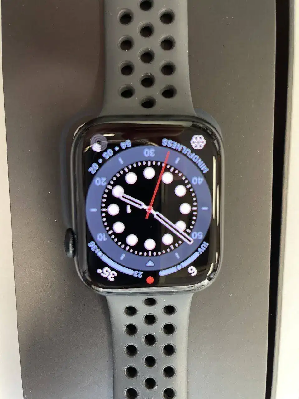 El reloj está comprado en tienda Apple directamente en noviembre 2021, con lo que aún le queda mucha garantía. Se entrega con su factura y se encuentra en un estado excelente ya que ha tenido muy poco uso, sólo destacar un roce muy superficial en el cristal, casi inapreciable, menos aún con la pantalla encendida, que como sabéis esta versión del Apple Watch siempre está encendida lo cual hace prácticamente imperceptible el roce, pero os lo intento sacar en una foto, que me ha costado bastante que se viera…