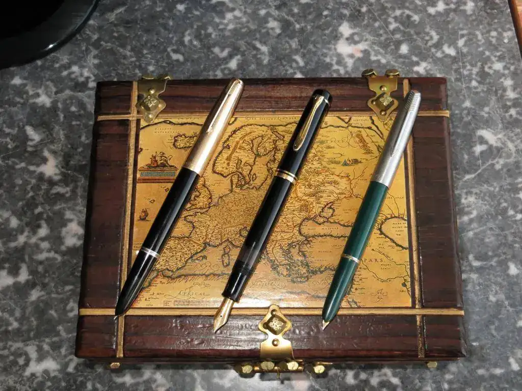 Decir que estas son una Pelikan, una Parker 51 y una Pinky. La Pelikan la compré en 1986 cuando me enteré lo que era escribir apuntes como un loco, no sé que modelo es exactamente pero es de una calidad extraordinaria, me costó 10.000 ptas (60 euros) que pagué en diez plazos. El problema que tenía es que en una caída a principios de los años 90 se rajó la pieza de plástico negra de lo alto del capuchón, una que va a rosca y coge además el clip y por ello se tiró en un cajón lustros. La Parker y la Pinky me las dio una tía mía cuando se enteró de que estaba buscando pluma, la Pinky era suya de cuando estudiaba, y la Parker de su padre (mi abuelo, fallecido en 1981) pero nunca las usé, ya tenía la Pelikan.