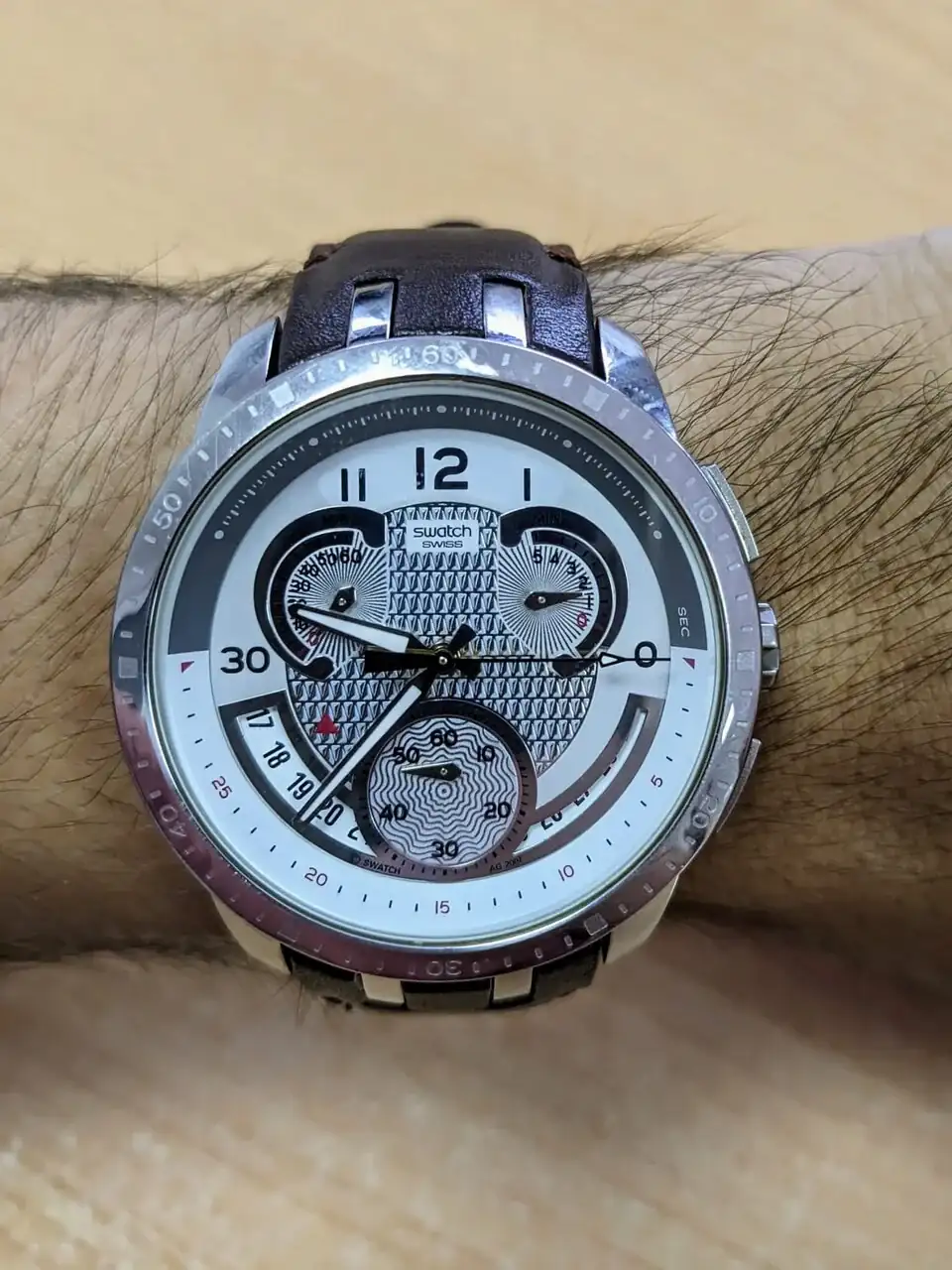 Luego tenemos este Swatch Retrograde YRS, el primero que me regaló mi pareja. Me sé el modelo porque recientemente tuve que buscar una correa, que Swatch ya no fabrica.