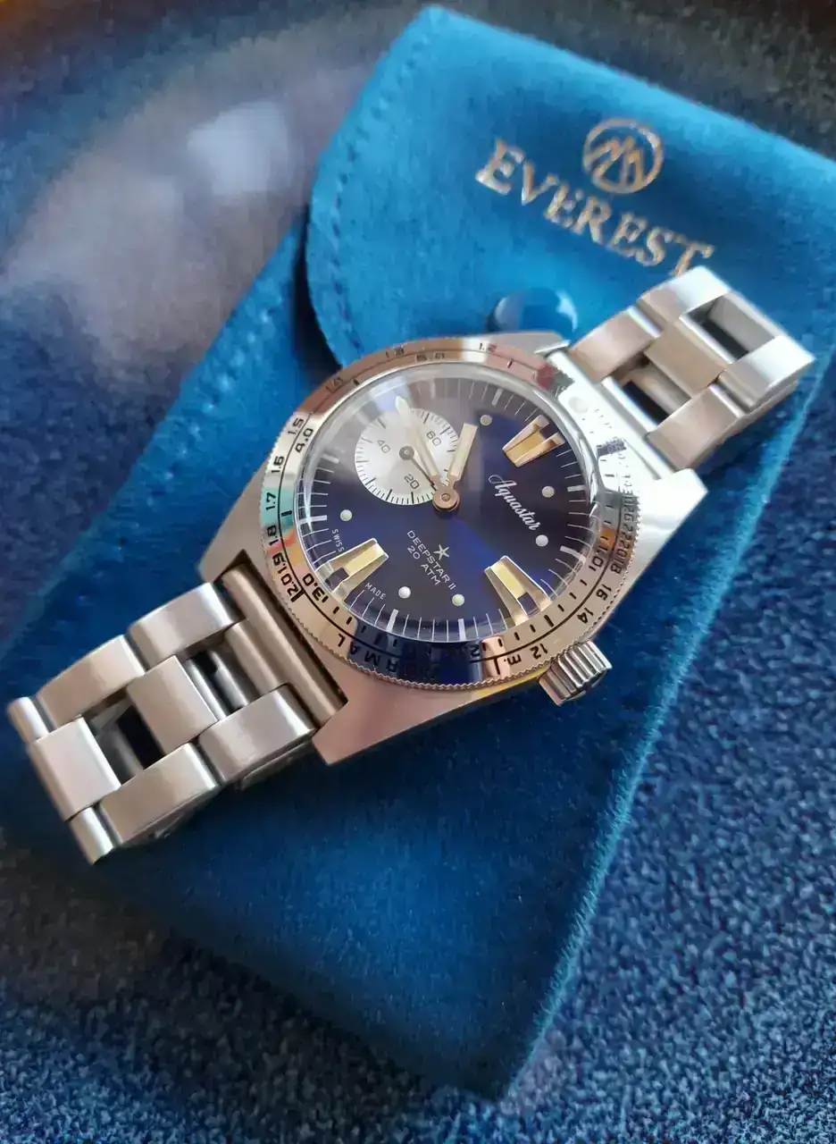 Hola a todos , hoy estreno este modelo al que tenía muchas ganas , el reloj en cuestión es un Duward aquastar 63 , modelo vintage más que conocido en el foro . Lo he comprado en estado , yo diría que casi nos , o como dicen ahora near mint . El reloj está pa verlo , es una gozada aunque necesita revisión , no va fino la verdad pierde unos minutillos , funciona todo, hasta el problemático bisel interno . Unas fotillos :