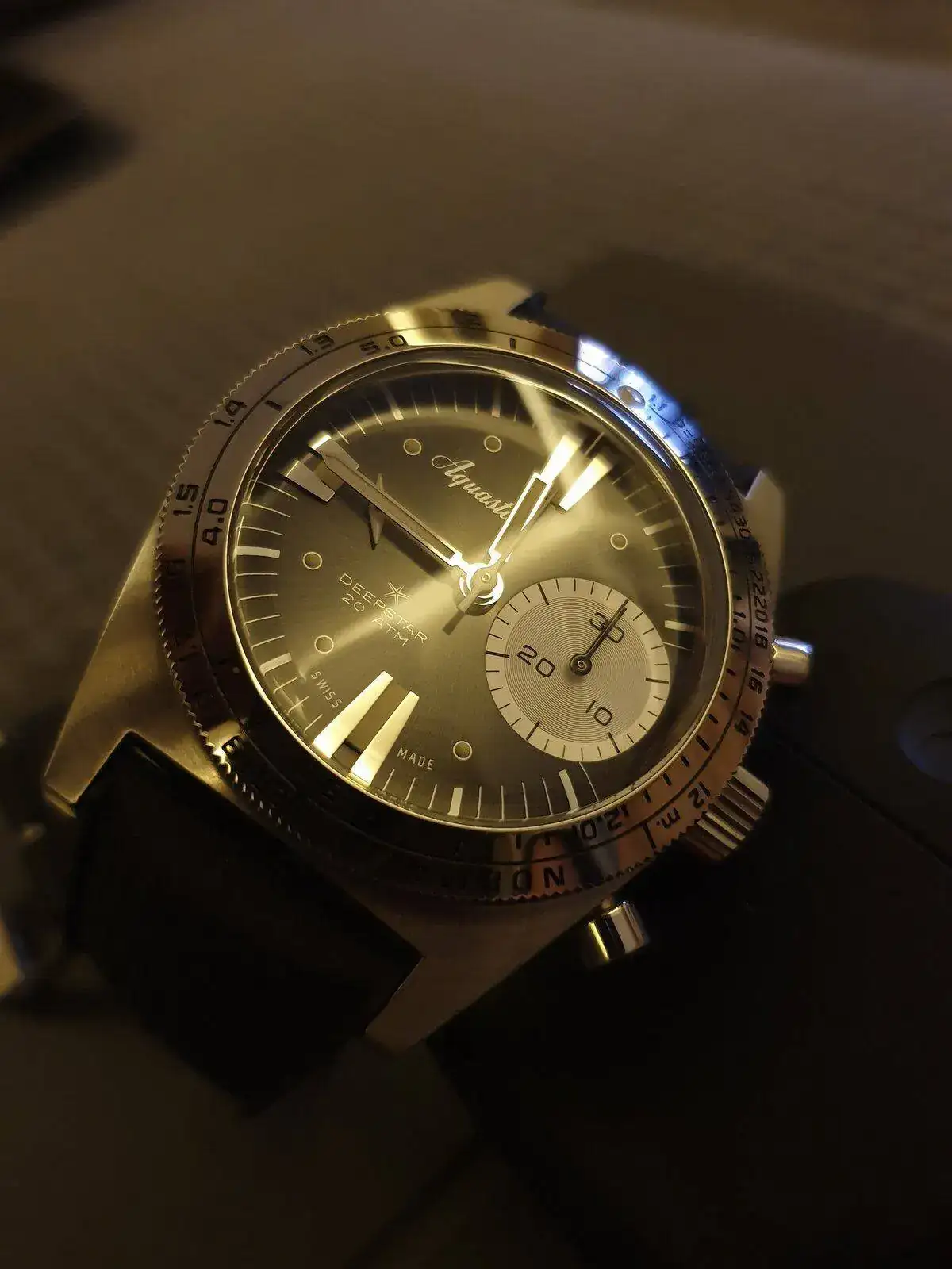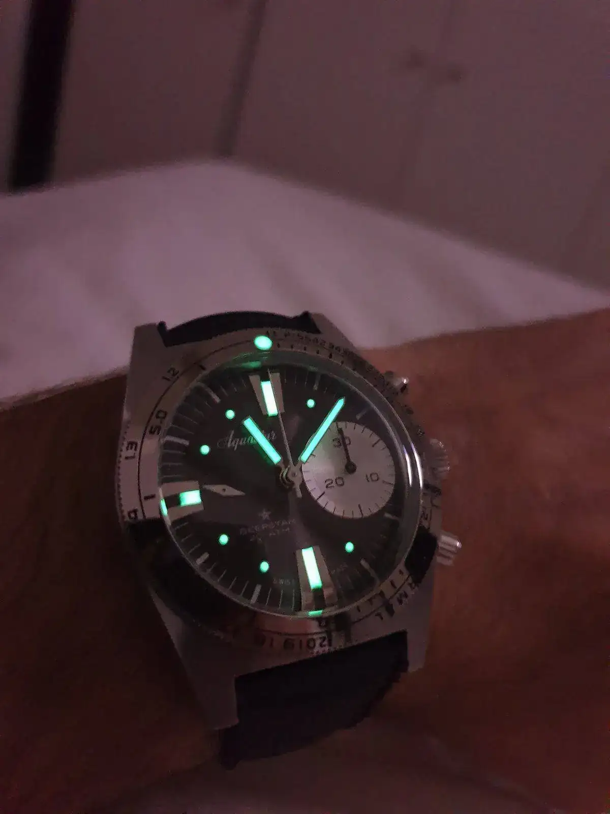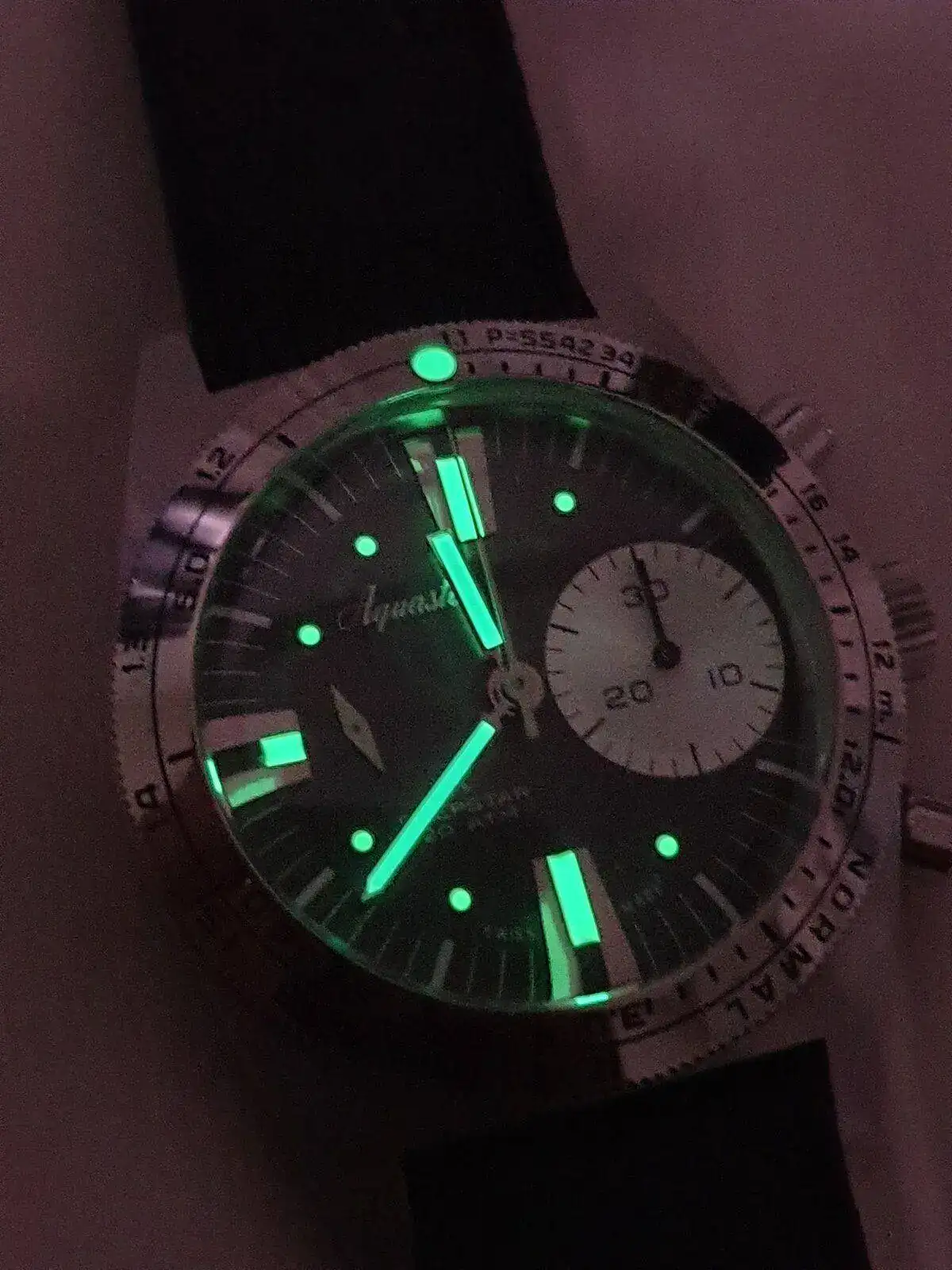 Monta calibre Le Joux Perret con rueda de pilares y embrague vertical que es una delicia de funcionamiento. Ni saltos ni arrancadas bruscas, tan fino como un Daytona. Al ser un reloj de buceo sus pulsadores son operables bajo el agua y tiene un lumen color azul muy generoso.