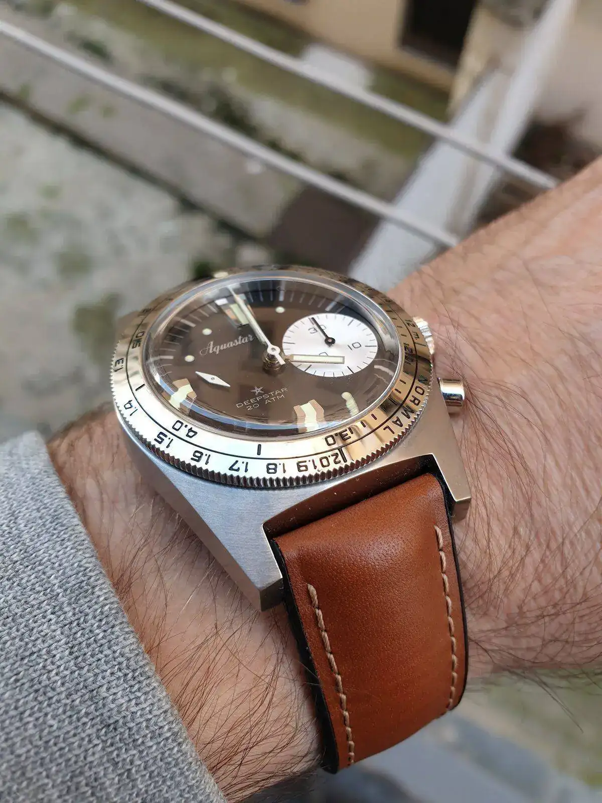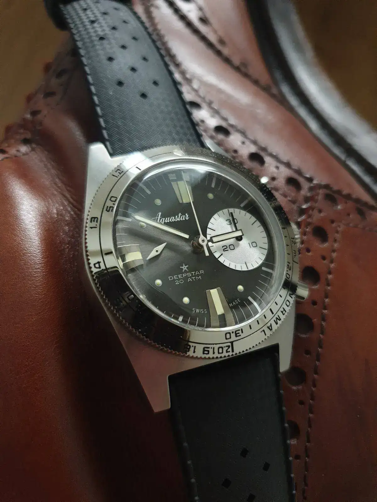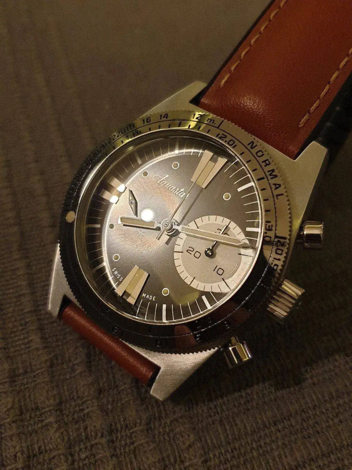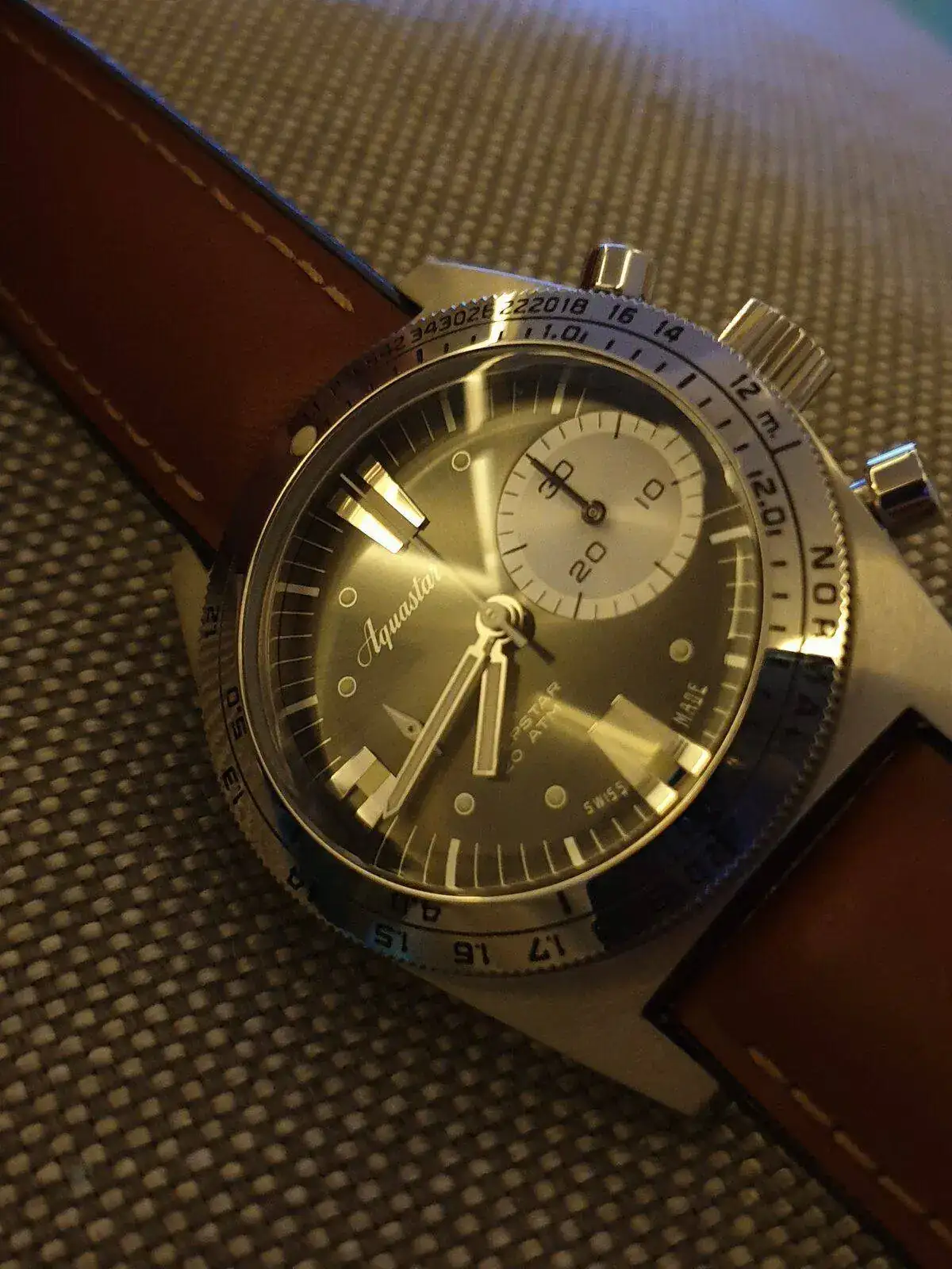 Monta calibre Le Joux Perret con rueda de pilares y embrague vertical que es una delicia de funcionamiento. Ni saltos ni arrancadas bruscas, tan fino como un Daytona. Al ser un reloj de buceo sus pulsadores son operables bajo el agua y tiene un lumen color azul muy generoso.