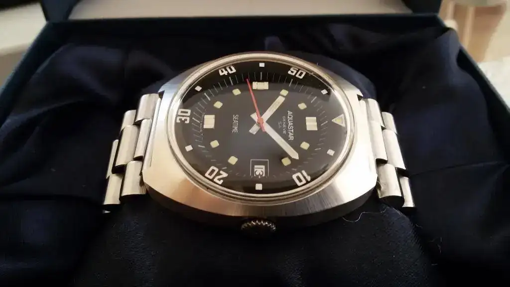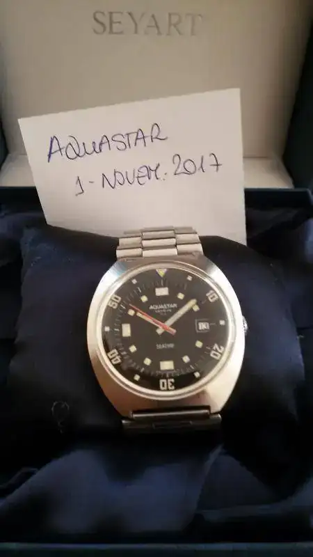 Pongo a la venta un Aquastar Seatime de mi colección que compré nuevo en tienda hace unos 25 años y desde entonces ha estado siempre guardado. Calibre AS automático, cristal plexiglás y corona a presión que al armar el barrilete acciona el bisel interno.