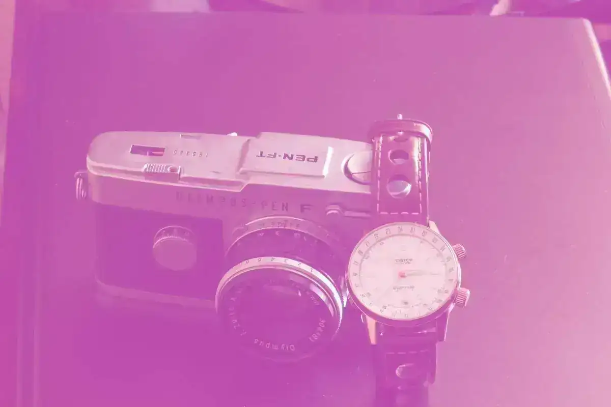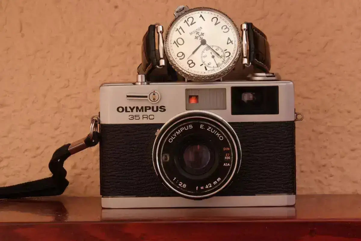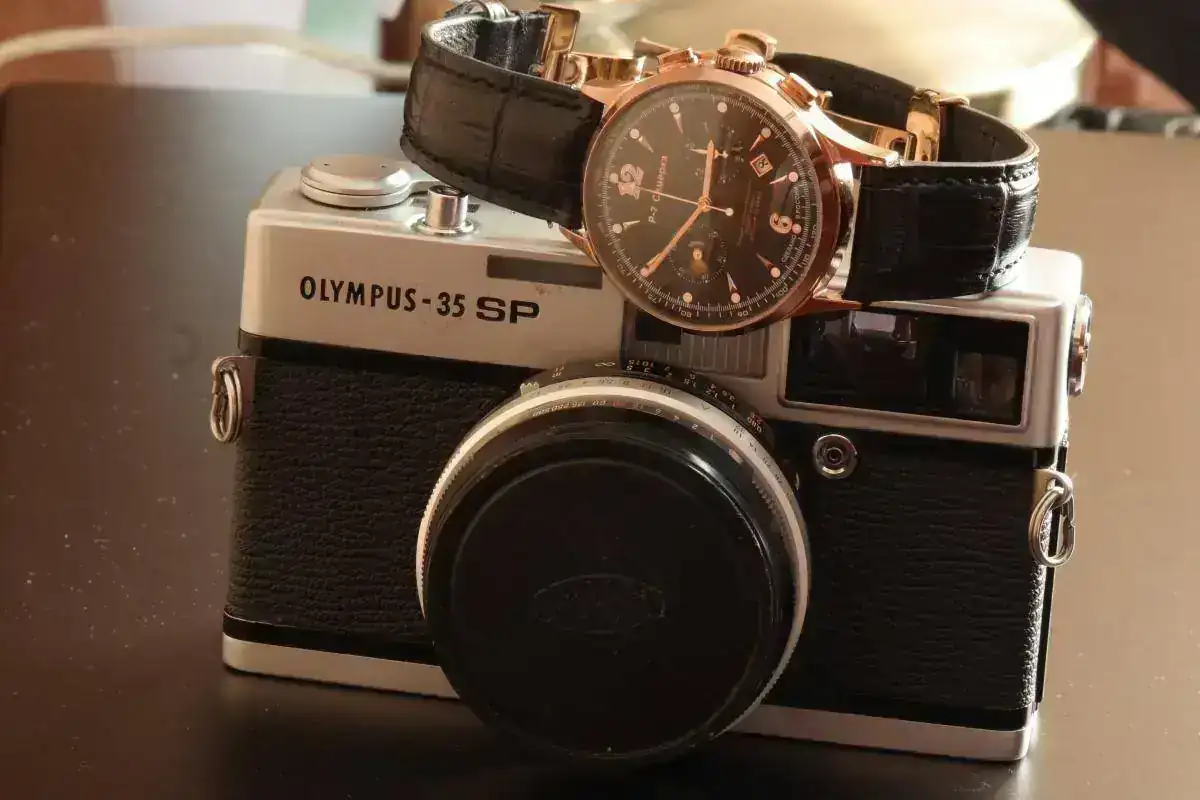 Ver el archivos adjunto 806195 Buscadisima OLYMPUS FT REFLEX DE 35 mm sin espejo con obturador rotativo de objetivos intercambiables , esta camara es de formato medio en 35 mm lo que se entiende que hace 72 tomas con un rollo de 36 fotos , lleva un f Zuiko 38 mm f: 1,8 de 6 lentes que le hace muy nitido . A su lado un Vostok -Europa con calibre 24 xx modificado para 2º uso horario 44 mm de caja en pvd dorado impresionante