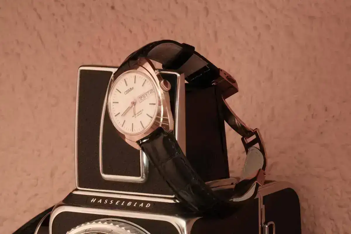 Slava en caja dorada con el mitico calibre automatico de 2 barriletes sobre la no menos mitica HASSELBLAD 500C![]()
