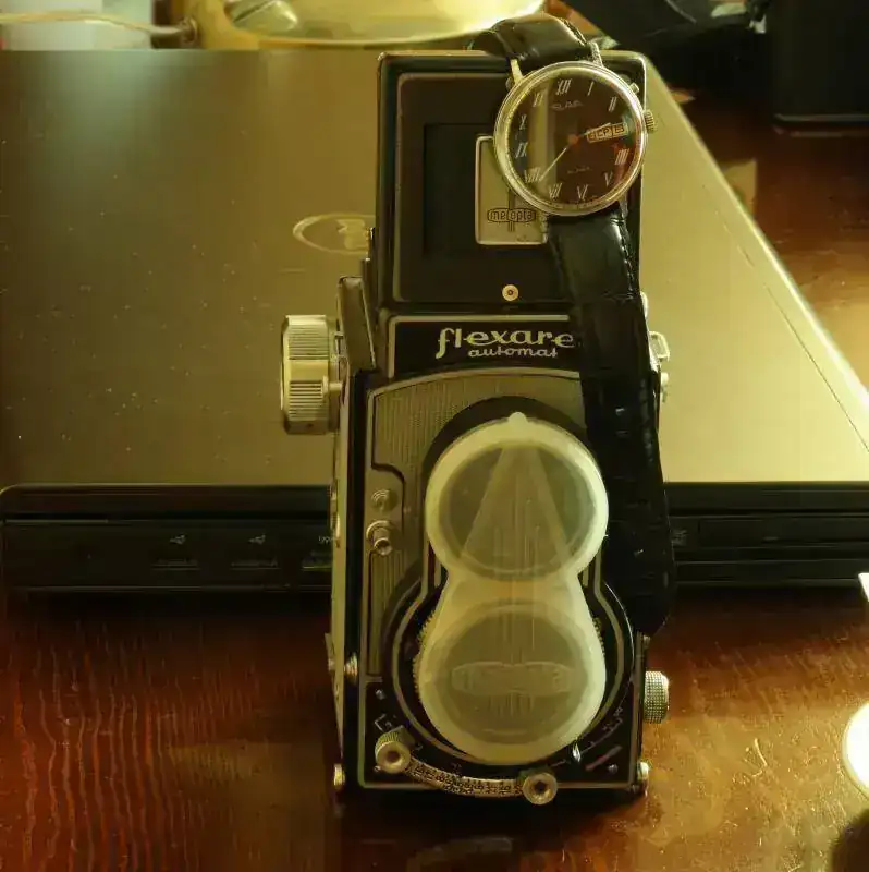 SLAVA carga manual con plexi que abarca toda la caja le hace parecer mas grande doble calendario a las 3 extraplano , un reloj muy elegante sobre la MEOPTA FLEXARET VII llamada la Rollei Checa .![]()