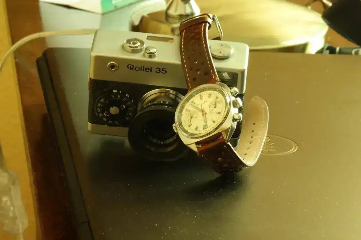 Hermoso POLJOT CALIBRE 3133 con correa Rally sobre Rollei 35 la compacta telemetrica analogica mas pequeña fabricada durante mucho tiempo .![]()