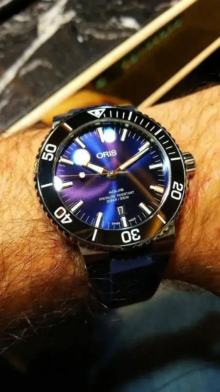 - Oris Aquis Date 43 mm. azul, automático, azul mate, tamaño en el límite pero no es muy alto (he visto 12,6 creo). La duda que tengo es el armis, que siempre me ha parecido demasiado contundente... También me gusta en verde y negro mate (en general prefiero los tonos en mate a los tornasolados).