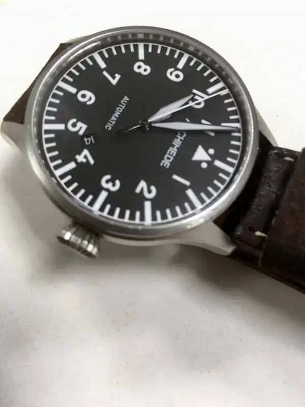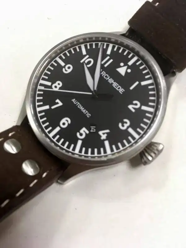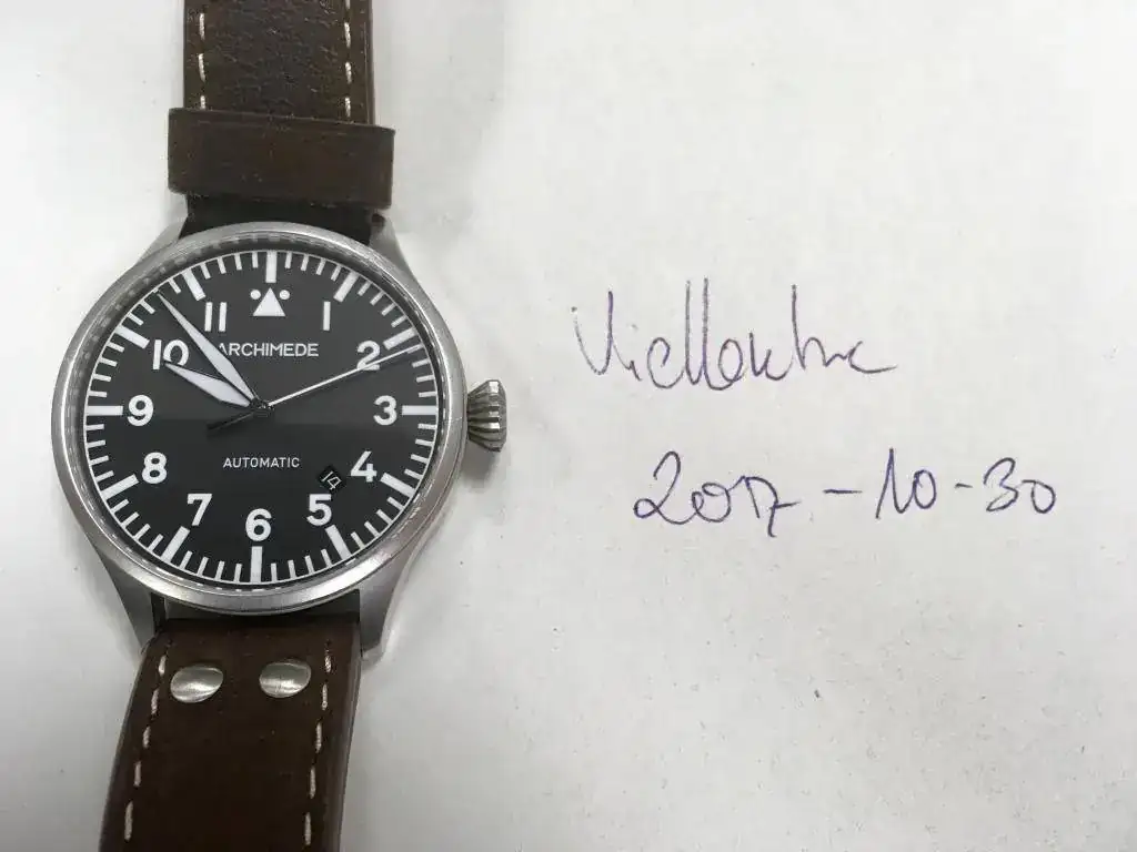 Sigo adelgazando colección. En este caso, sale un archimede pilot de 42mm automático con su ETA 2824-2. Poco más que decir de este clásico. Fue revisado hace 4 años en la tiendecita del reloj (Madrid) y va muy bien de marcha. Tiene una pequeña marca entre la 1 y las 2 que he intentado reflejar en una de las fotos.