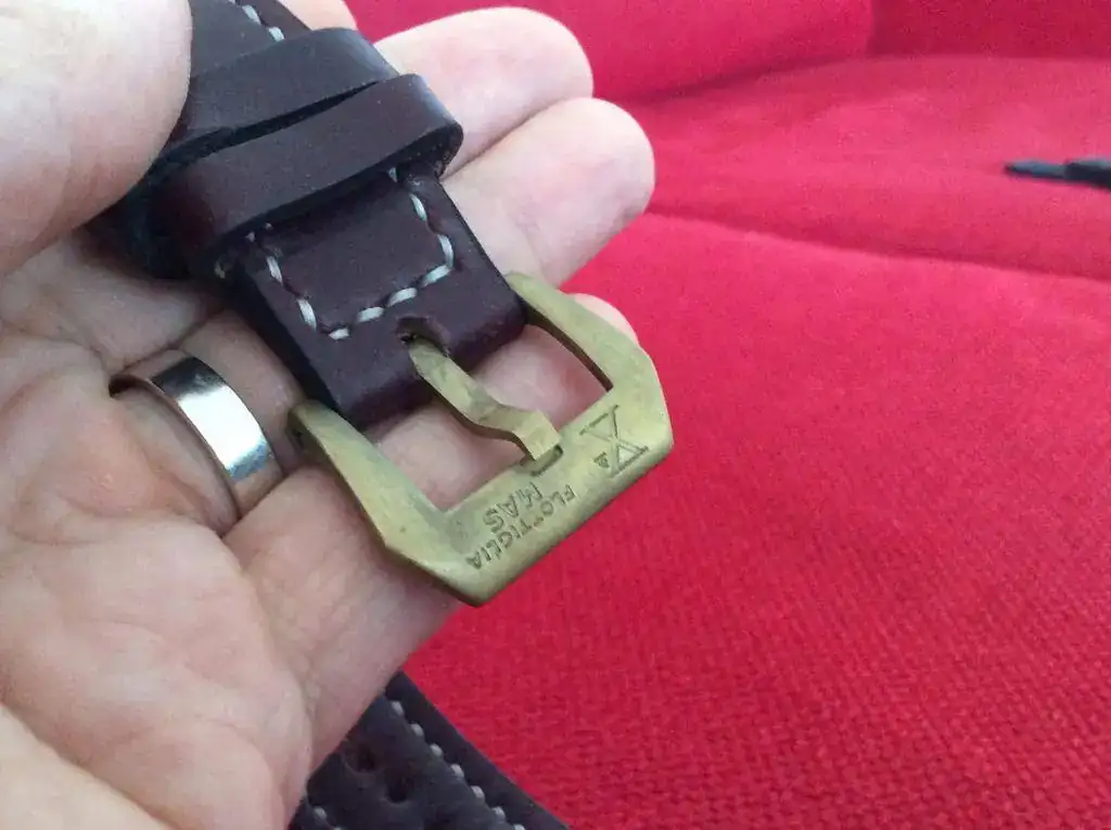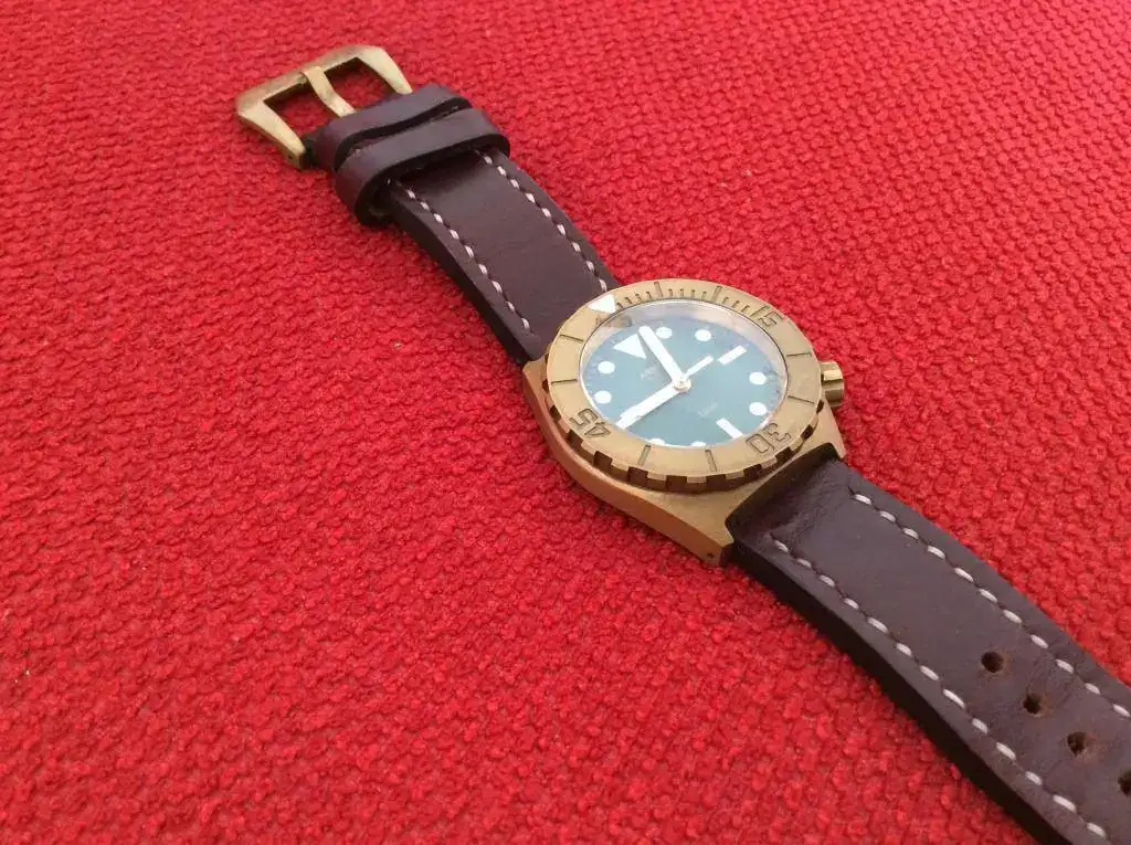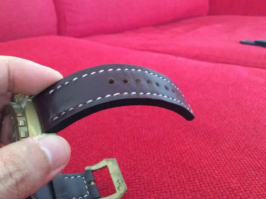 Si se quiere la correa de piel se tendría que añadir 50€ ya que es cuero Shell Cordovan de la empresa Horween (me costó más). Tiene un efecto envejecido con aceites y lleva una hebilla de latón a juego de la "flotigia X-Mas", que le queda de vicio. Si el comprador no la quiere iria al fcv de complementos. Tiene muy pocas puestas.