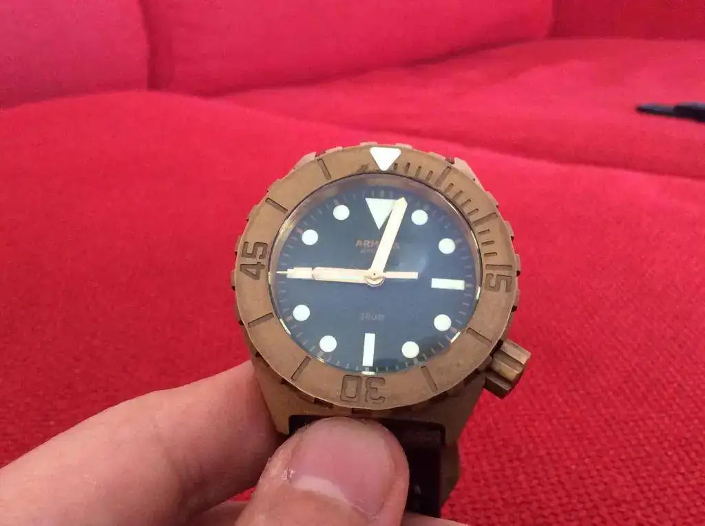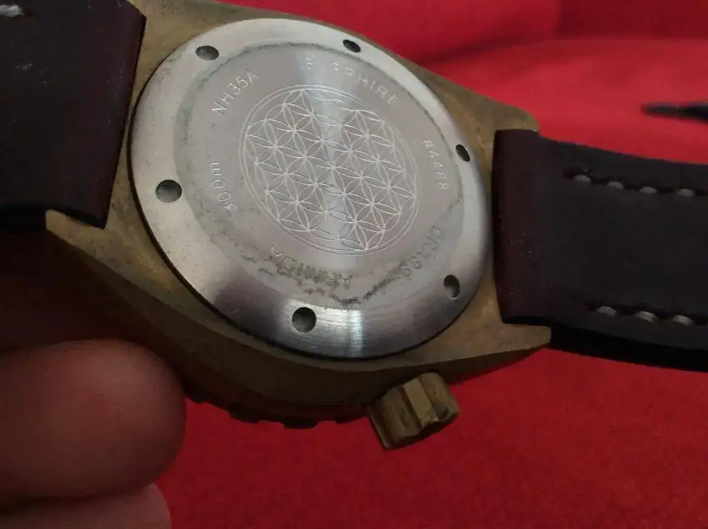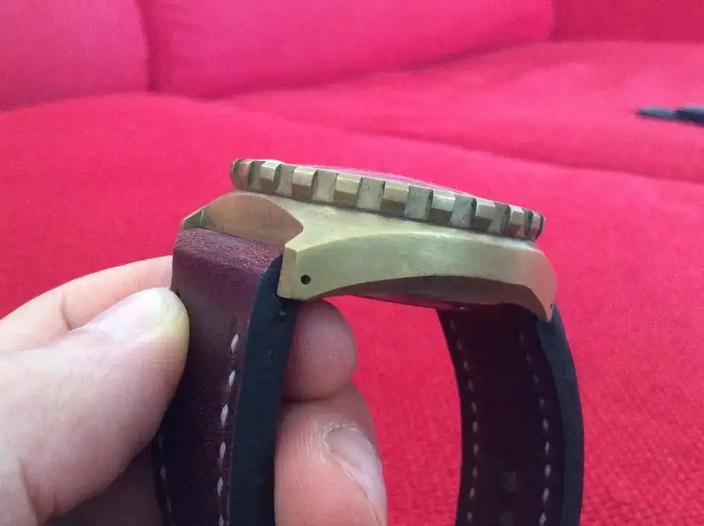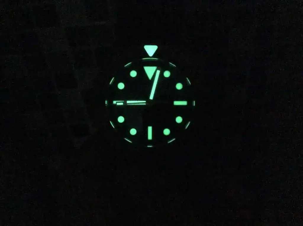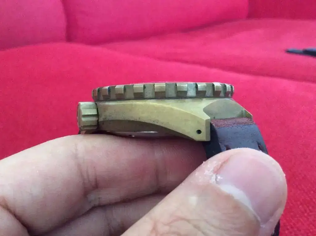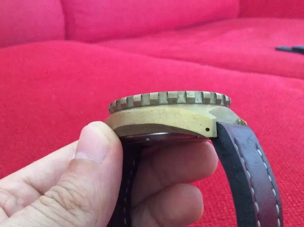 El reloj no presenta marcas de ningún tipo, o al menos yo no he sido capaz de ver ninguna. El bisel gira perfectamente, haciendo todos sus "clicks" como debería. El reloj iría con su caucho, el cual esta en perfecto estado, como se pueden ver en las fotos. El reloj tiene una preciosa pátina por el verano pasado. Si se quiere se puede devolver a su antiguo aspecto, pero vamos... así está precioso. En cualquier caso, hay hilos al respecto. Respecto al lumen... es una linterna, como se puede apreciar en la foto. Todo un diver 300mts a prueba de bomba. ideal para el verano.
