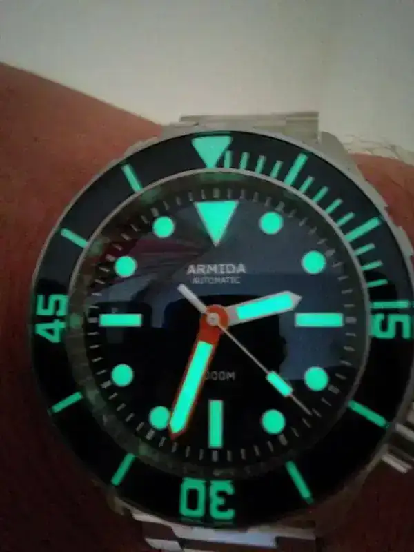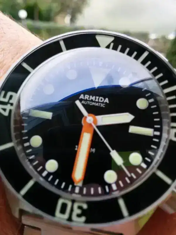 El armis le queda perfecto , el reloj es superlegible como buen diver , y el cristal abombado le hace muy bonito.