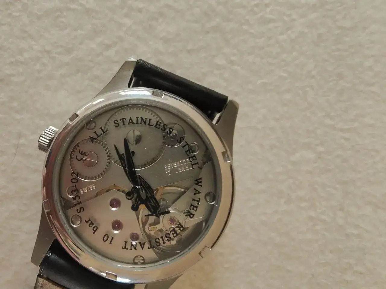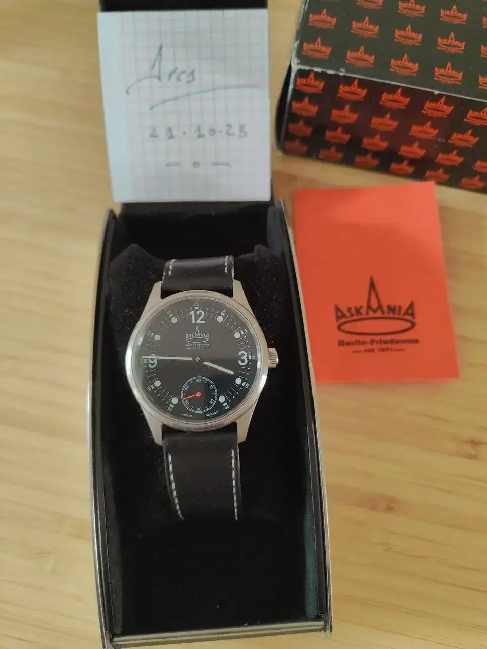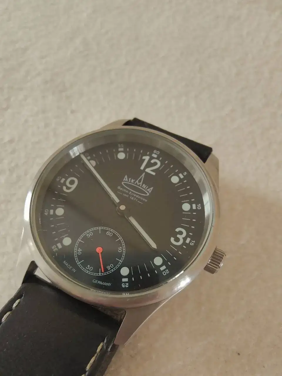 Buenos días, a la venta este Askania alemán tipo pilot, mecánico con una formidable Unitas, en esfera negra. Funciona perfectamente y sin marcas o rasguños. La correa no está en buen estado pero es la original con el cierre de la marca. Ahora la ficha: