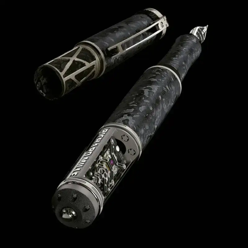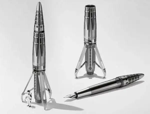 La firma Maison Caran d’Ache en colaboración con el fabricante de relojeria MB&F, lanzó a finales del pasado año esta estilográfica basada en un sueño infantil del fundador de la compañía relojera mencionada, Maximilian Büsser. El modelo es una serie limitada de 99 unidades y tiene el mérito de ser el instrumento de escritura más complicado fabricado por la casa suiza, requiriendo unas 500 operaciones manuales para su fabricación y que además escribe. La pluma va acompañada de una estuche que hace las veces de plataforma de lanzamiento y se complementa con un muñequito astronauta magnético para darle más realismo. El precio anunciado para esta pluma es de 19900 dólares.
