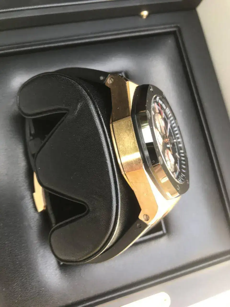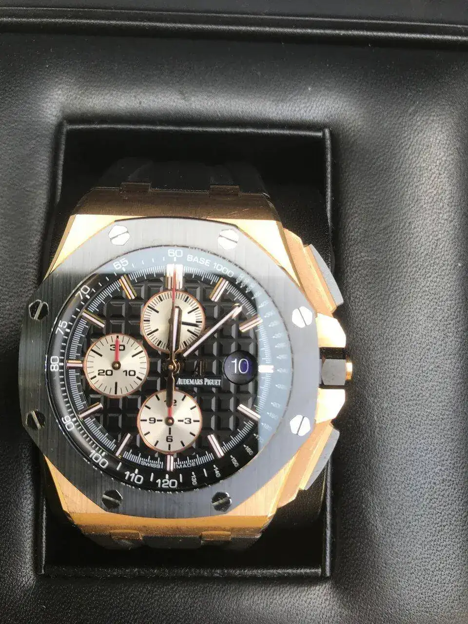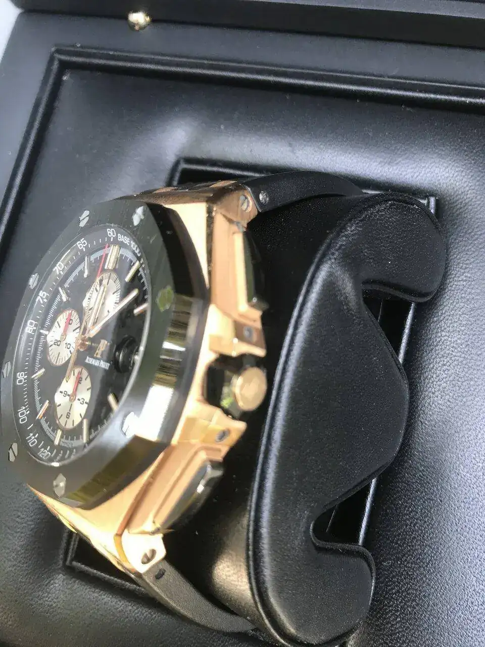 Buenos días, les propongo hoy este excepcional, precioso y único AP en oro rosa con bisel y pulsadores en cerámica. Ha tenido un uso más que moderado y básicamente por eso sale. Como creo que sabràn, este reloj viene de serie con una correa de caucho, que, he de decirlo, muestra algún signo de desgaste. En principio sólo contemplo su venta, pero estaría dispuesto a un trueque por algún PP o AP que me guste. Paso, sin más, a la ficha técnica de rigor: