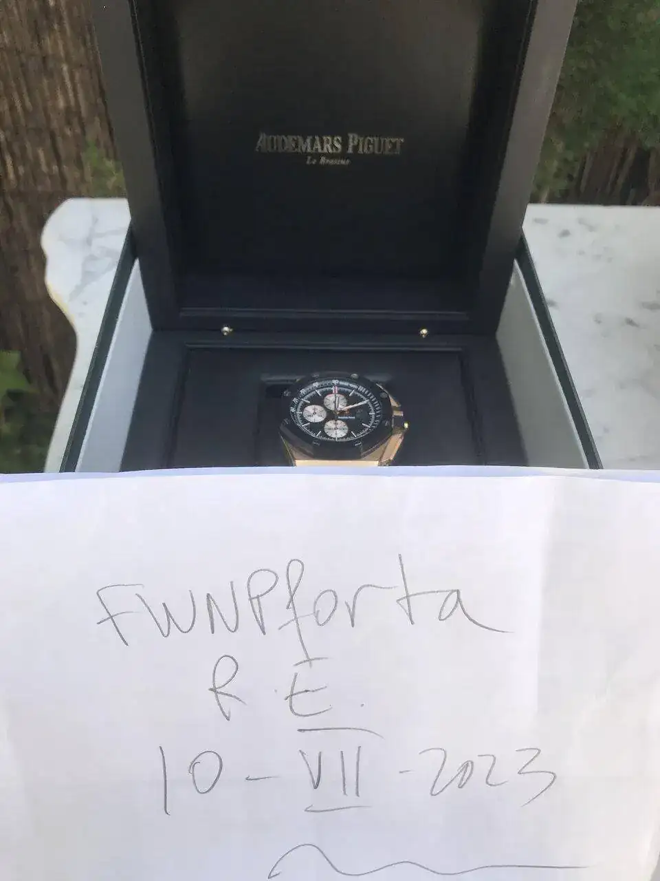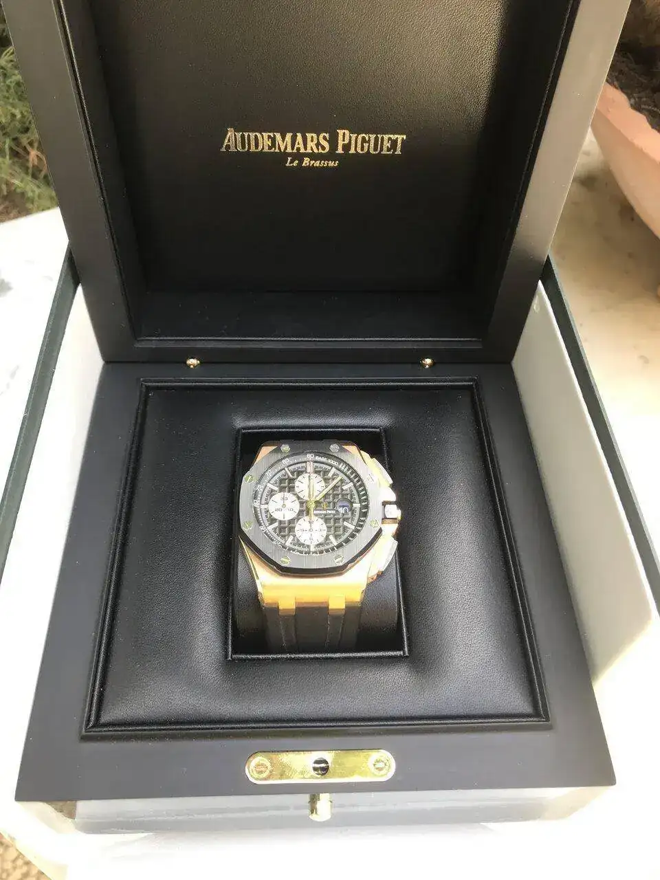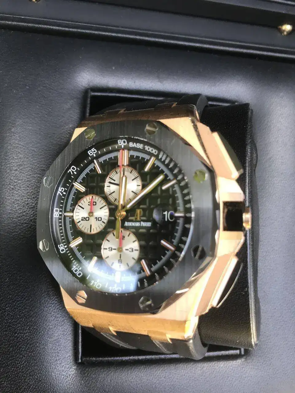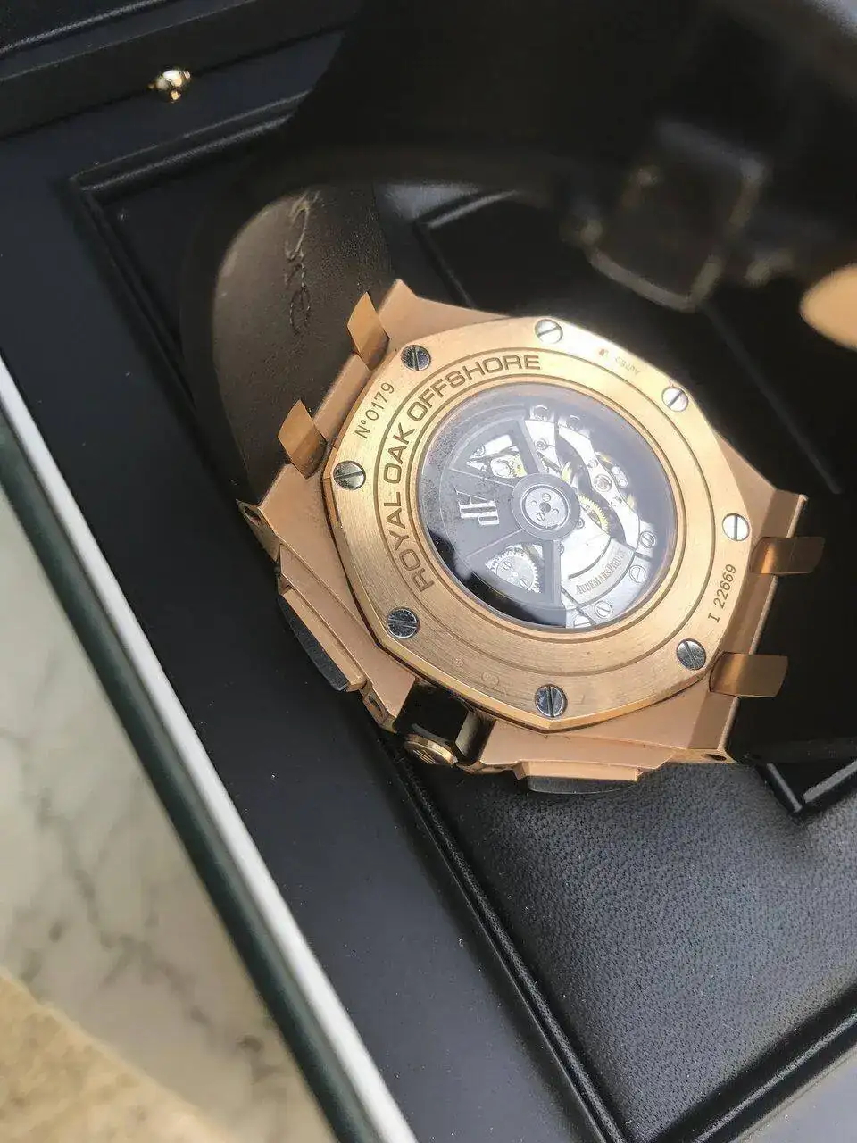 Buenos días, les propongo hoy este excepcional, precioso y único AP en oro rosa con bisel y pulsadores en cerámica. Ha tenido un uso más que moderado y básicamente por eso sale. Como creo que sabràn, este reloj viene de serie con una correa de caucho, que, he de decirlo, muestra algún signo de desgaste. En principio sólo contemplo su venta, pero estaría dispuesto a un trueque por algún PP o AP que me guste. Paso, sin más, a la ficha técnica de rigor: