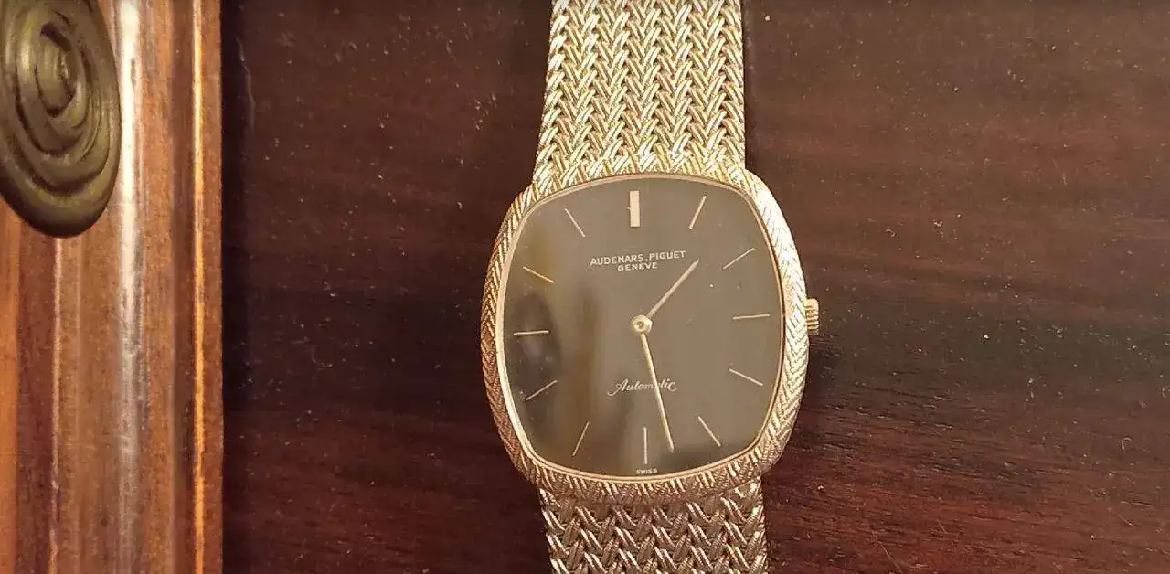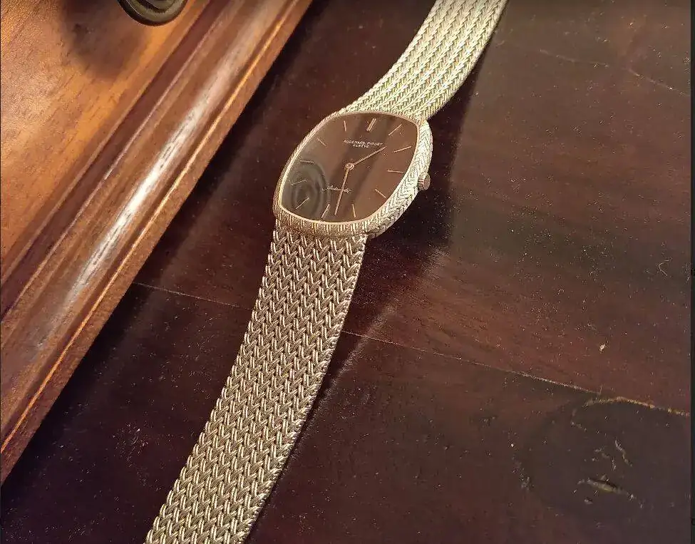 Es una AUDEMARS,PIGUET Automatic en oro blanco con armis milanaise soldado a la caja y dormido casi 50 anos en la caja fuerte, no tiene mas que cinco puestas, esta como nuevo. El armis no esta torcido como es normal para este tipo de brazaletes, por supuesto nada roto, o algun dia (mal) reparado.