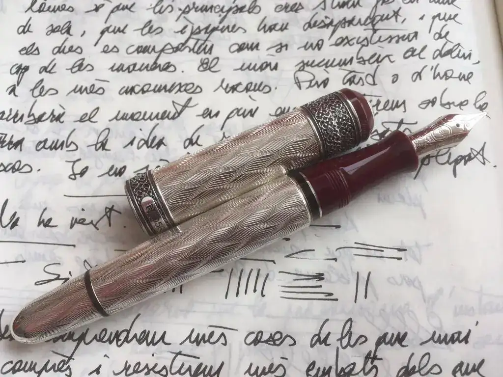 Y si era para celebrar mi aniversario, bien podía tratarse de una estilográfica que también celebrase un aniversario, aunque no fuera el mismo. Al final me decidí por la belleza que os presento a continuación. Por ahora no puedo deciros gran cosa. Llevo tres días escribiendo con ella, probando papeles y cuadernos. Es una delicia a pesar de que el plumín es sensible al ángulo con el que escribo (hay un cierto ángulo con el que falla un poco el trazo). Veremos si la hago afinar o si por ahora intento hacerle un poc de quilometraje por mi cuenta.