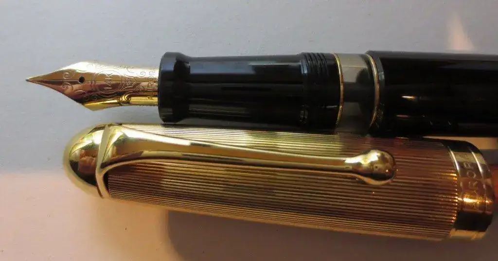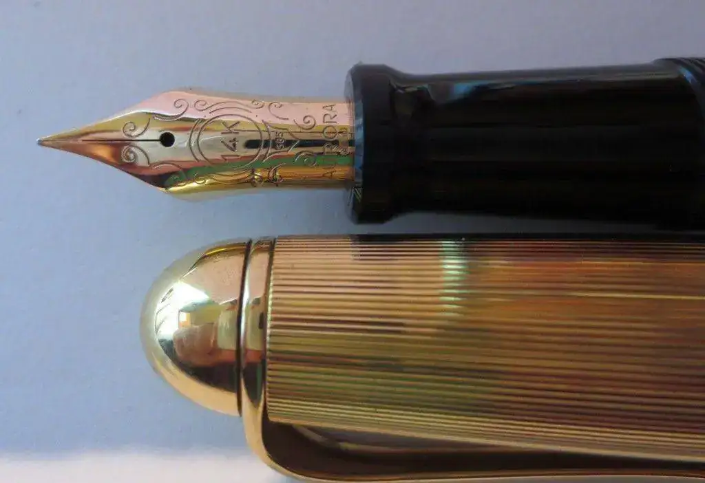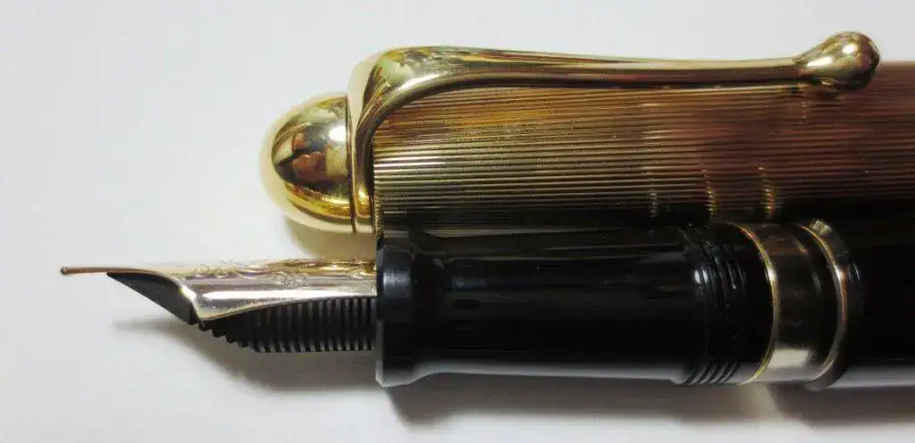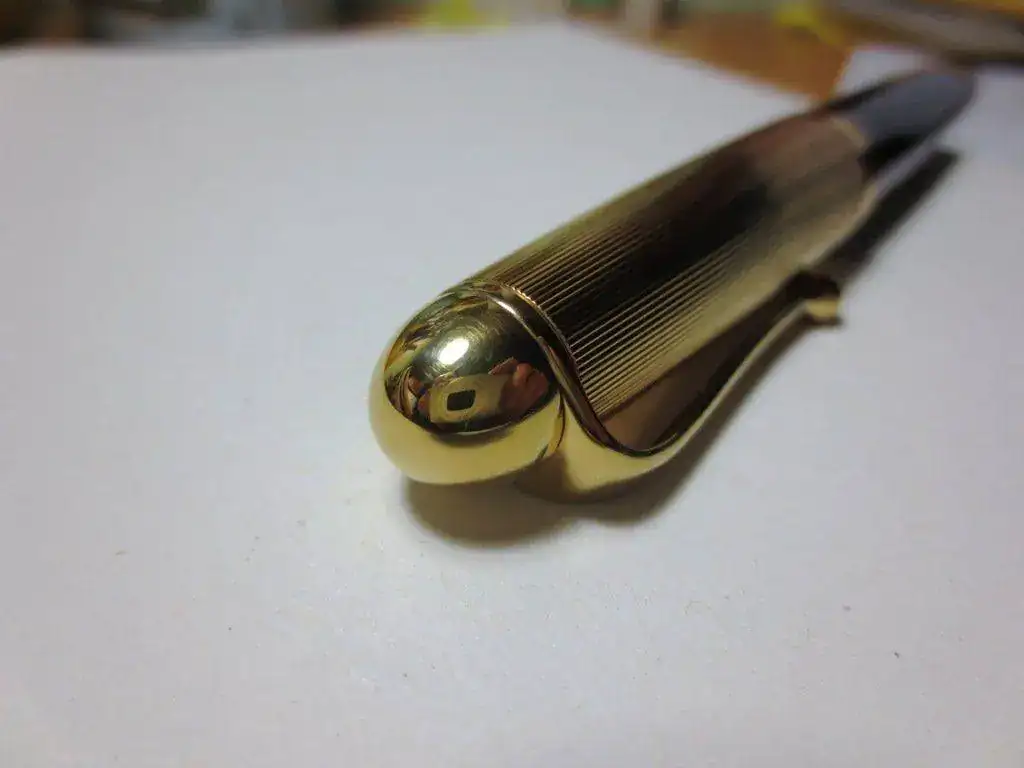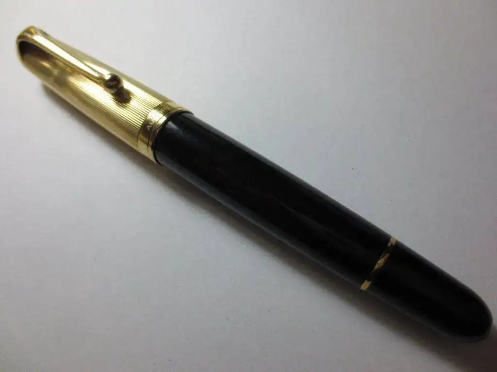 Se trata de una pluma pocas veces entintada y en perfectas condiciones (no tengo la caja). Tiene las típicas ligeras rayitas de uso, solo visibles con lupa. Su plumín es fino y su alimentador es de ebonita lo que garantiza el flujo y la suavidad. Dispone del sistema de reserva de tinta, útil cuando te has quedado seco y te saca del problema.