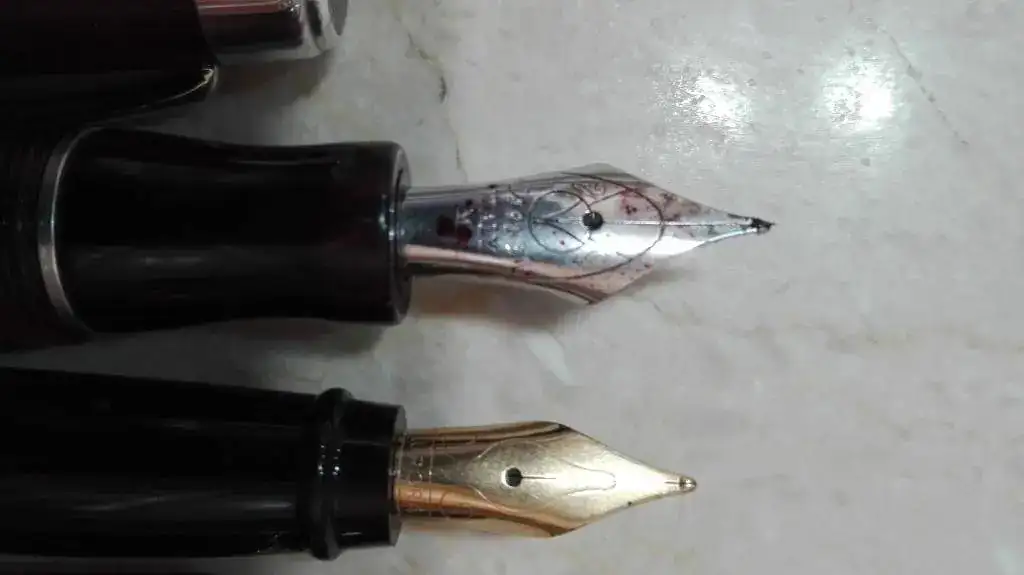 La aurora no escribe mal, no hay trazos en falso etc, pero da mas sensacion de aspereza, tal vez no sea malo, pero ahora al orincipio se e hace extraño. La estoy usando con una tinta lamy y la sensacion, siendo mbos plumines m es que la urora es mas "seca" y tal vez. Por es me parece que escribe mas fino. No se, con el tiempo estonque se me hace raro tal vez lo aprecie y se convierta en una virtud. De lo que me alegro. Mucho es de no haberla comprado con punto F.