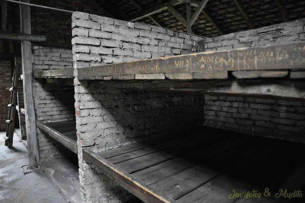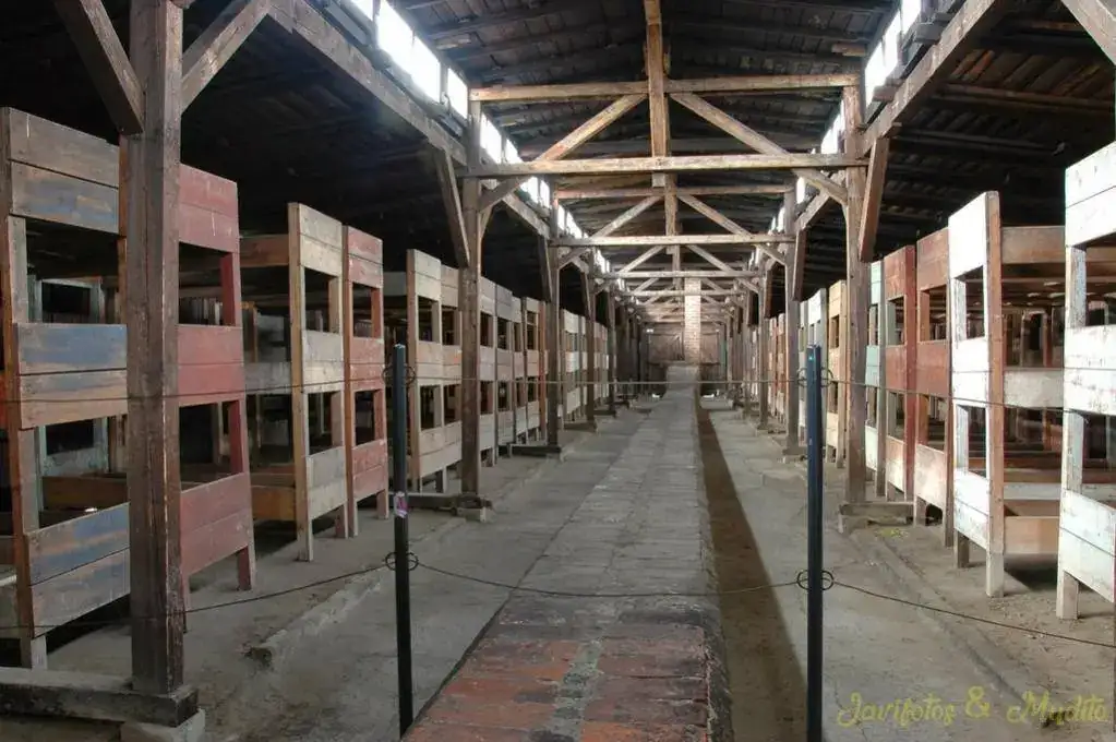 Esto es el interior de uno de los barracones donde dormían hacinados los prisioneros, Estos barracones, eran más pequeños y se construyeron a posteriori porque, el campo de concentarción se les quedaba pequeño. Los barracones principales, eran así :