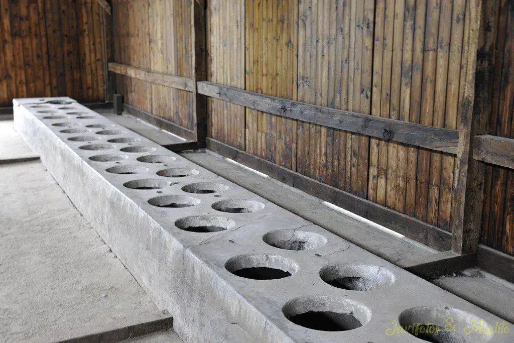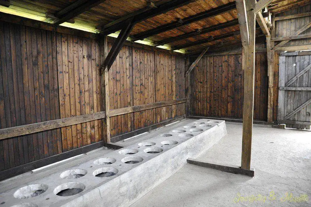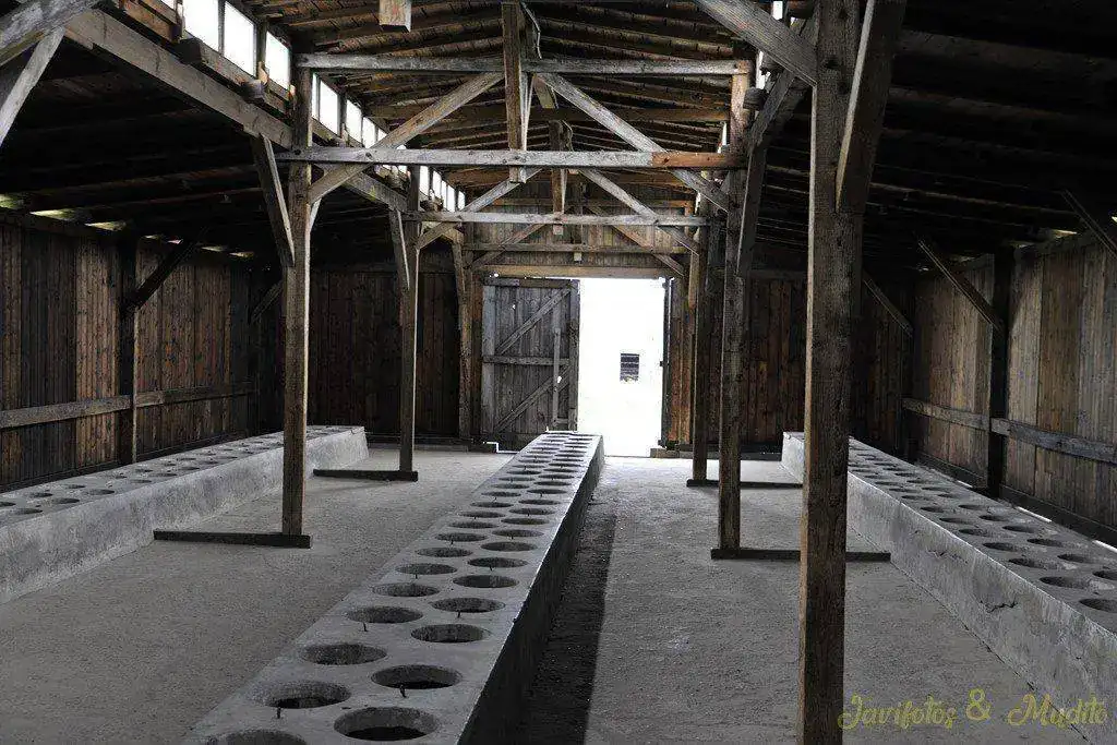 Estas son las letrinas, como veis, no son baños individuales.La finalidad de que fueran así era, humillar a los prisioneros.Los nazis querían que se vieran los unos a los otros .Una vez los depósitos llenos, eras los prisioneros los que se encargaban de vaciarlos.