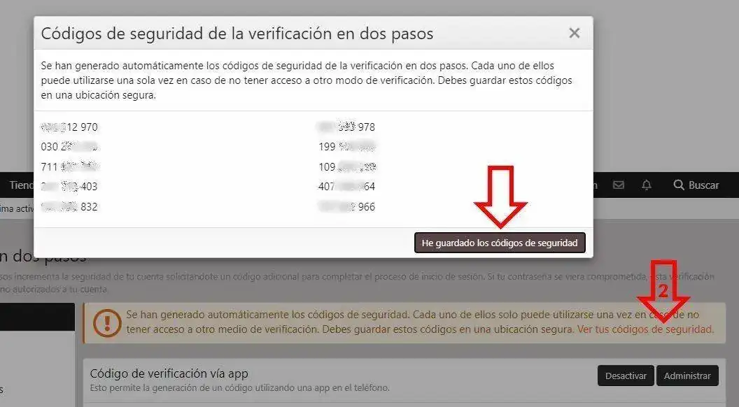 Una vez hecho, nos aparecerá una lista de códigos que habrá que guardar en lugar seguro. Son los que nos permitirán recuperar en caso de pérdida del smartphone. Repito, GUARDAR esos códigos. Si por atolondramiento le das al botón marrón todavía los podrás recuperar en la segunda flecha (2)