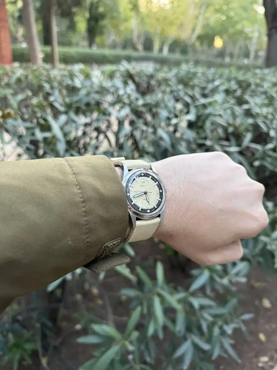 Las primeras impresiones son muy buenas, quitando un aspecto que le resta algo de practicidad. El reloj está bien proporcionado y a la mayoría de personas le quedaría bien en términos de tamaño y con la correa estilo tropic hace que pese poco y sea cómodo de utilizar. El dial me ha sorprendido lo que más, en las primeras imágenes me gustó mucho pero no pensaba que fuera a ser tan bonito en directo, se diferencia muy bien la parte central (en este caso en color beige) de la parte exterior en color negro y los marcadores le aportan una sensación de profundidad muy marcada.