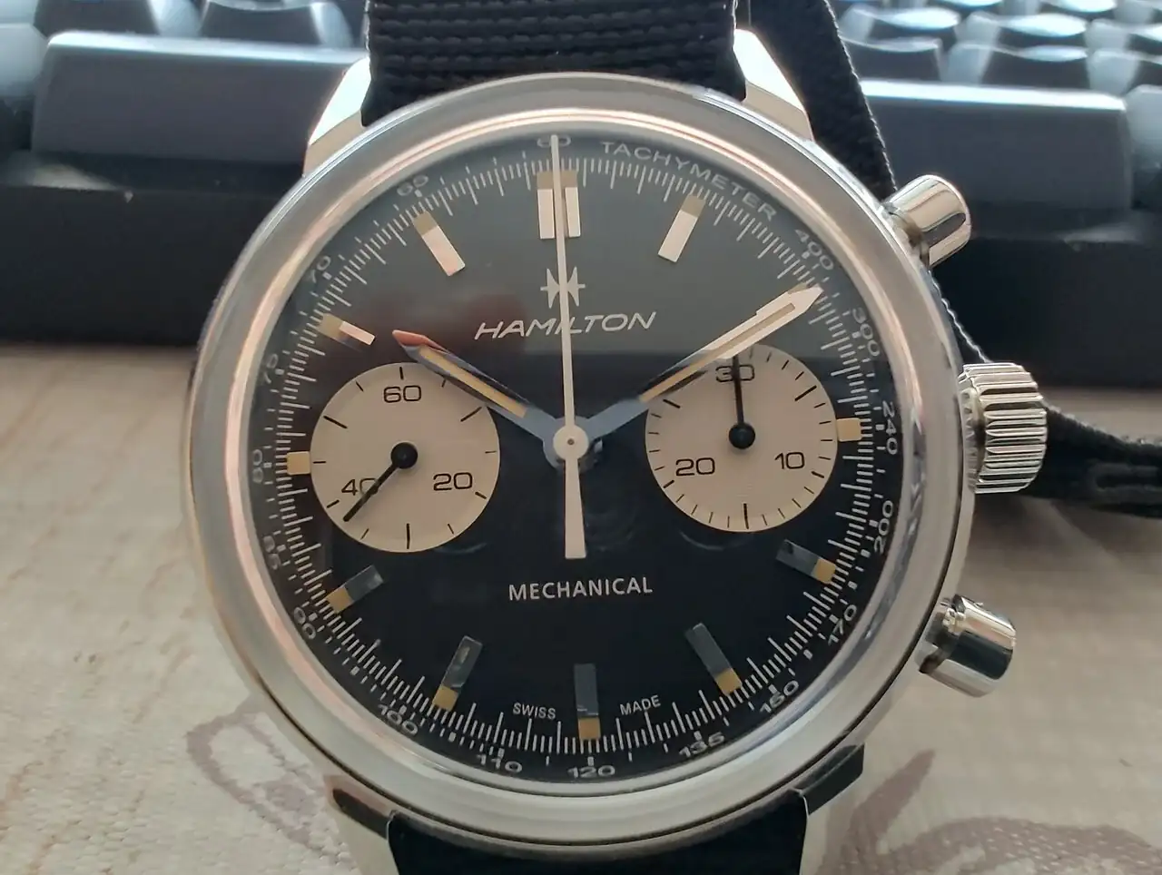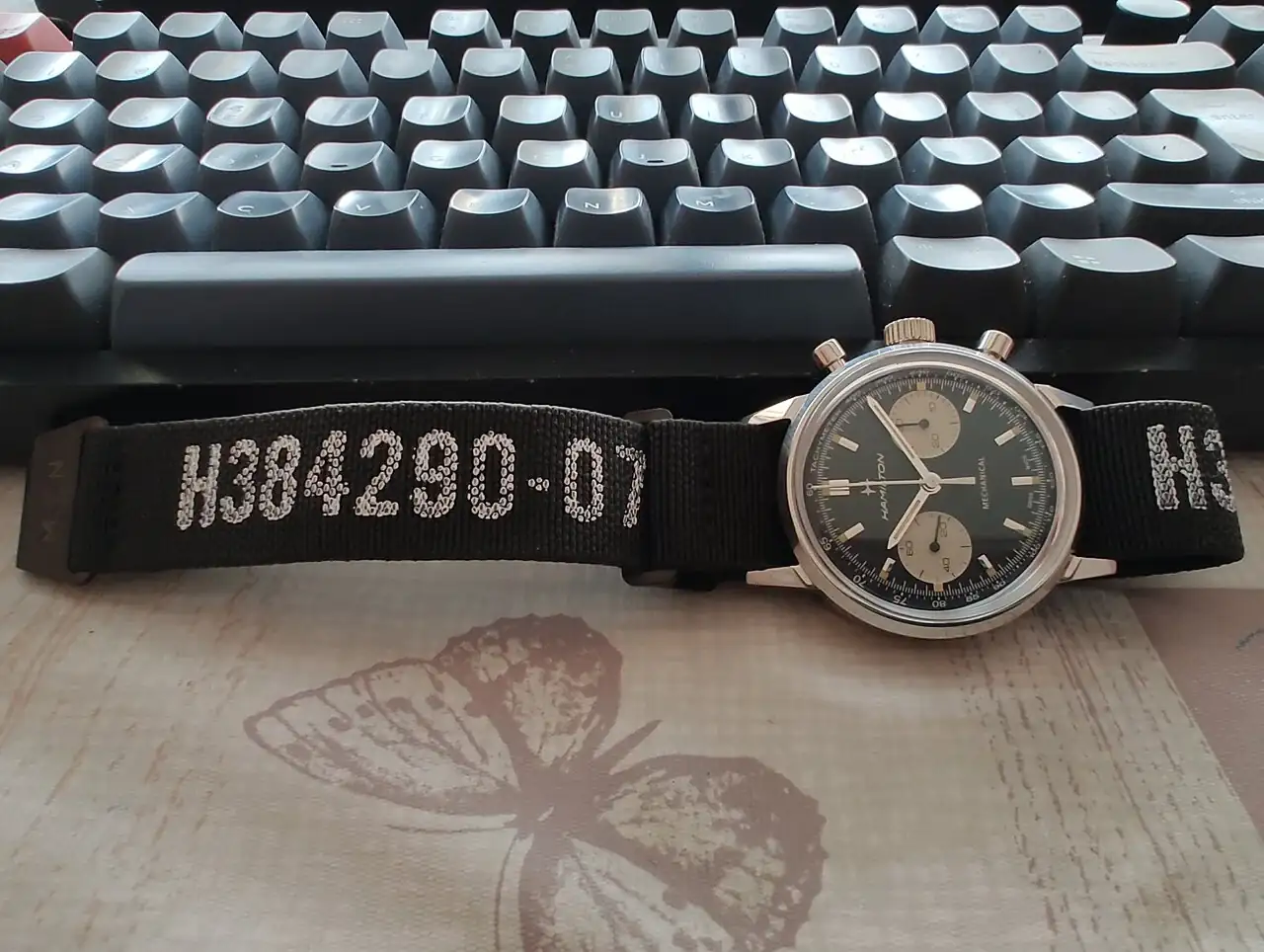 El pasado 4 de Dic cumplí las 52 primaveras y aproveché tal magno evento para regalarme mi primer reloj "caro", un Hamilton Intra-Matic. Llevo por tanto unos quince días con el reloj, y la mar de contento, pero he decidido no presentarlo en sociedad hasta hoy, que me acaba de llegar la que será su correa definitiva. Una preciosa Marine Nationale de Erika's (creo que el reloj justificaba el desembolso extra) personalizada con el número de serie el reloj y mi número de la suerte. Es súper cómoda, muy resistente y creo que aunque no es una opción típica si que le queda bien a la pieza. En todo caso, aquí tenéis el resultado.
