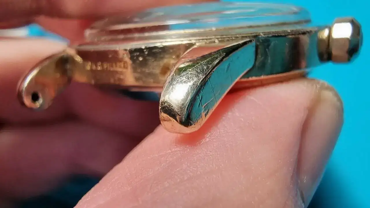 Pese a que un laminado tiene un espesor mayor que un baño, desafortunadamente en este caso estaba muy deteriorado y todo lo que se podía adivinar en las fotos del anuncio se tornó en algo peor al poder ver el reloj in situ. Tanto en flancos de caja y asas como en la zona superior de la caja (bisel) el laminado de oro presentaba importantes daños; algunos rayones y golpes eran muy profundos. Además tal y como se atisbaba en las fotos del anuncio, y pese a ser un acabado en laminado de oro, no un baño, los extremos de las caras superiores de las asas estaban ya pelados dejando a la vista el acero inox del que está hecha la caja.