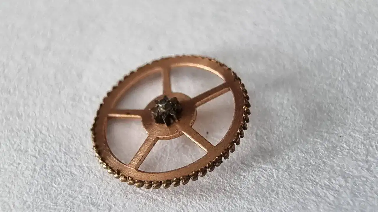 Una vez desmontado el dispositivo automático del resto del movimiento me encontré el primer problema que no iba a poder ser subsanado con una simple limpieza y un nuevo lubricado. Se trataba del desgaste de la rueda reductora del citado dispositivo, causado por el trinquete de tope que actúa sobre ella mediante un resorte/muelle. Y este es uno de los problemas que se pueden generar en estos movimientos si no se les hacen revisiones regularmente. Desconozco cuando fue la última vez que se le realizó un servicio a éste, pero estoy seguro de que fue hace mucho mucho tiempo (...en una galaxia muy muy lejana...) a tenor del estado de la rueda reductora y de la suciedad acumulada en el resto de componentes en general.
