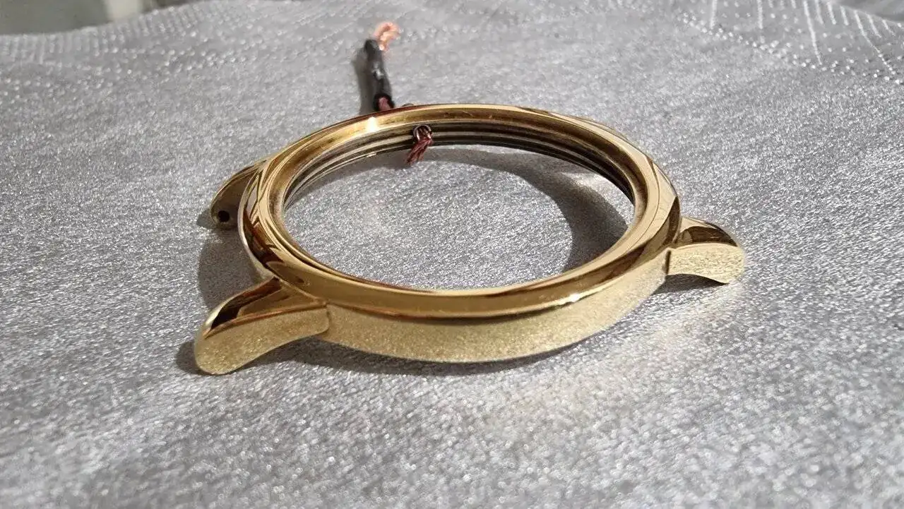 Resultado de la caja (y corona) tras la segunda fase/fase final de la galvanoplastia realizando baños con electrolito de oro 24K con aditivo de cobalto ("hard gold"):
