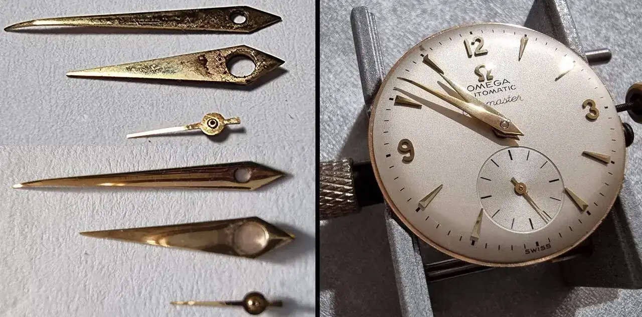 Las manecillas, al igual que todos los elementos aplicados de la esfera chapados en oro, estaban muy sucias y opacadas; ha sido necesario realizarles una limpieza y también han mejorado bastante. En la parte superior de la imagen de la izquierda podéis ver las manecillas todavía sucias, y en la parte inferior las manecillas ya limpias, lo malo es que no sé qué le ha pasado a la cámara del tfno: debido a los brillos no era capaz de enfocar bien las tres manecillas juntas una vez ya limpias, de todas maneras creo que se distingue bien el cambio pese a la falta de enfoque. En la foto de la derecha la esfera ya montada sobre el movimiento y con las manecillas puestas (con esa luz y justo en ese ángulo se puede apreciar la textura granulada de la pintura a la que antes hice mención y también su tono ligeramente perlado):