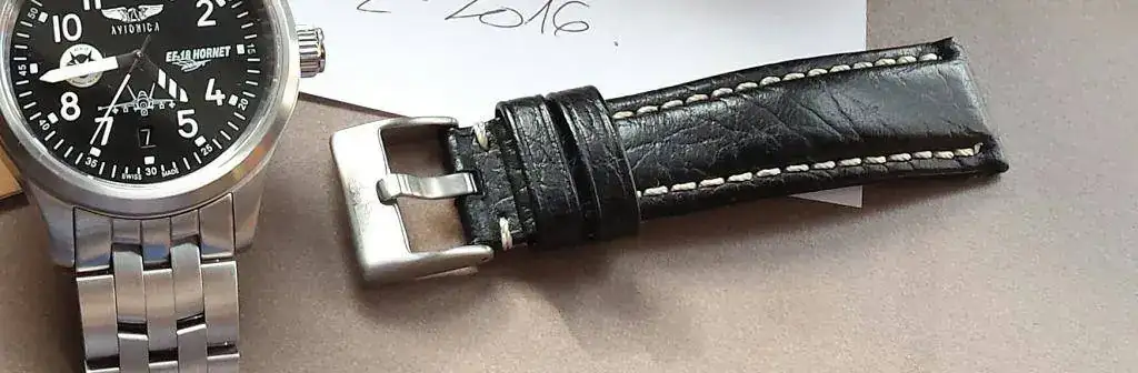 Esta es la correa de cuero, tiene la hebilla firmada con la marca del fabricante