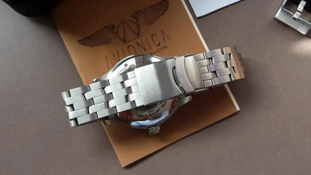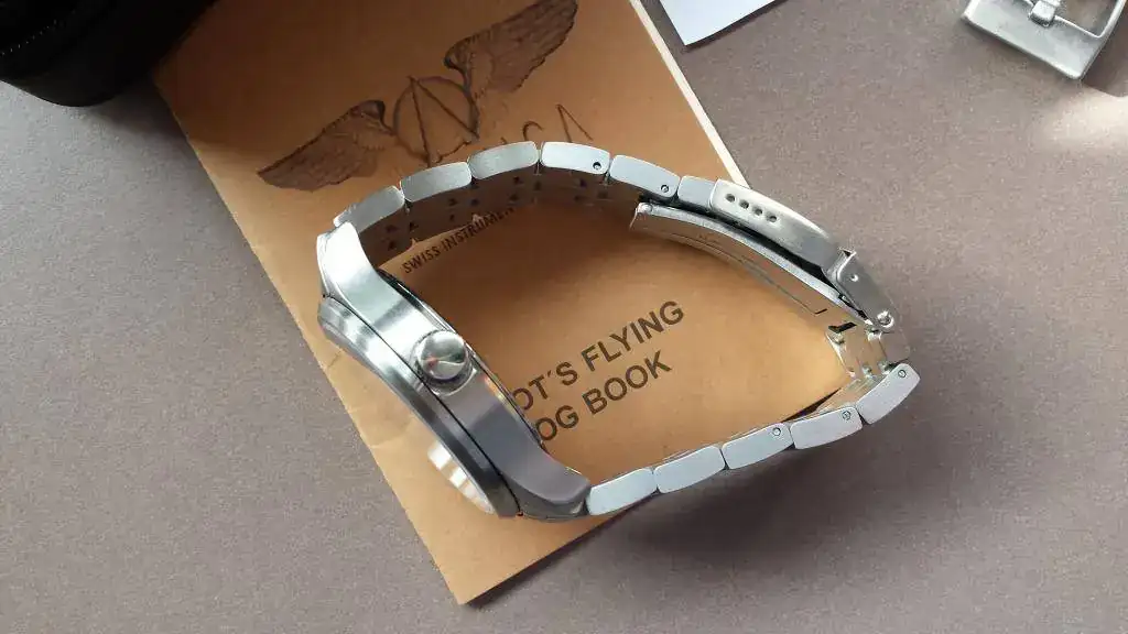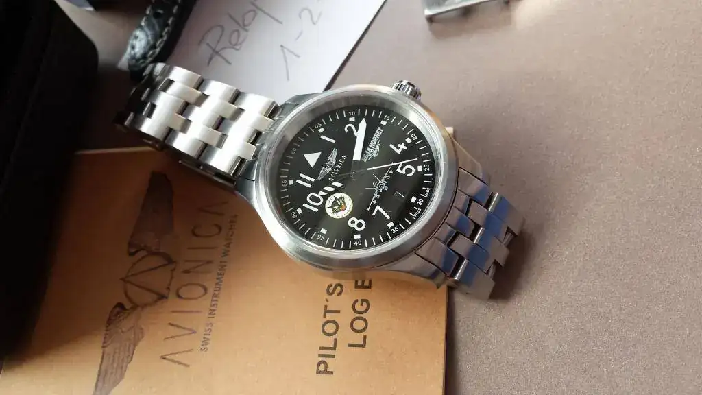 Se trata de un flieguer con el atractivo logo de Ala 12, sumergible 100 metros, con un discreto calendario a las 6, cristal de zafiro, maquinaria eta 2824, lleva ya la corona roscada y firmada (las primeras versiones traian la corona a presión), además sus 42 mm lo hacen muy ponible.