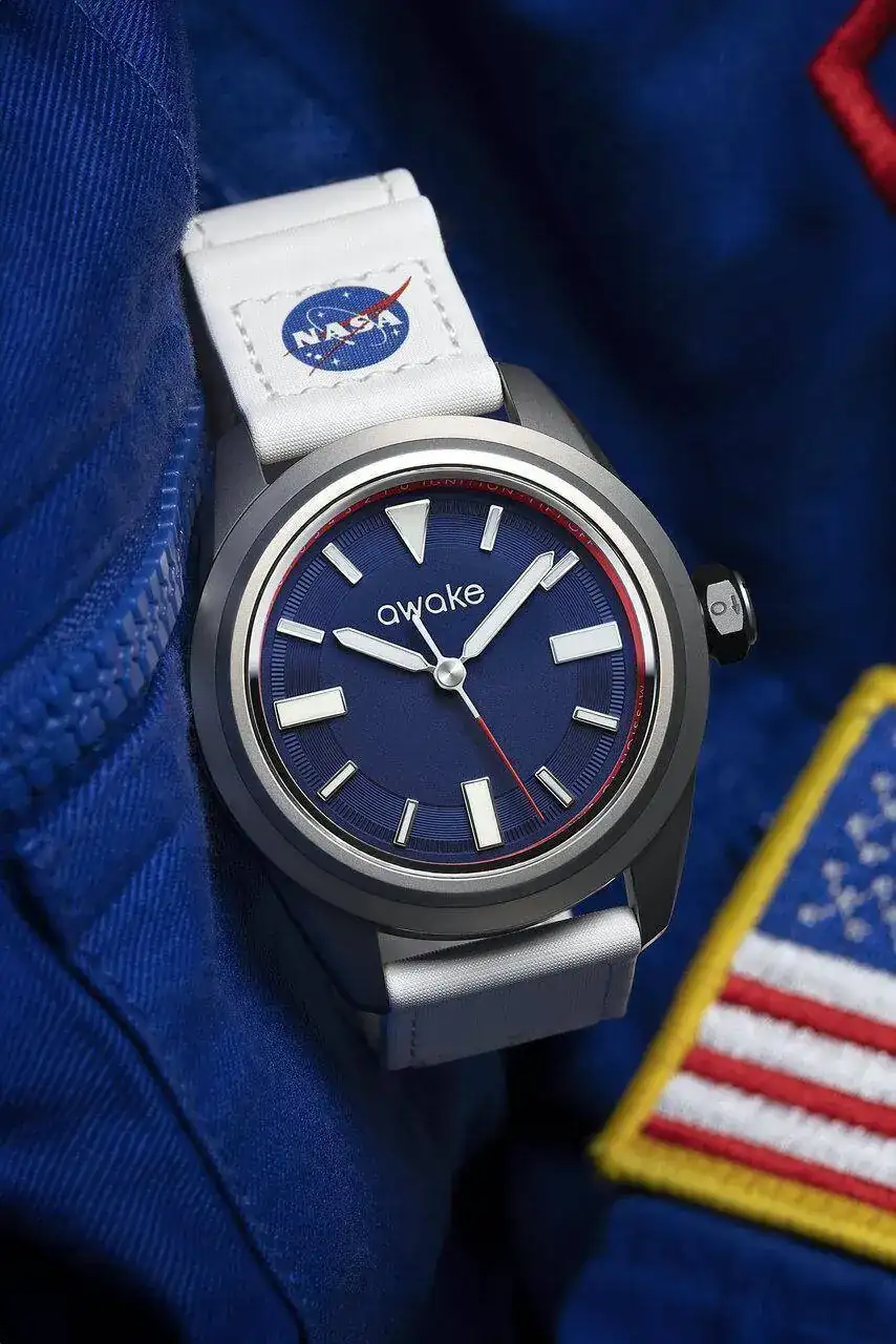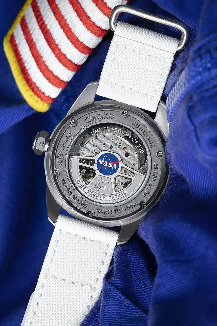 La caja, de titanio reciclado al 70 %, mide 40 mm. Tiene un cristal de zafiro con tecnología ID GLASS NFC, una corona atornillada grabada con los símbolos L (Bloqueado) y O (Abierto), y es resistente al agua hasta 100 metros. Logotipo de la NASA grabado en el lado de la caja.